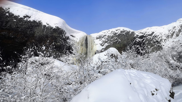A grand peine, j’atteins enfin la cascade - le lieu le plus visité de l'Aubrac avec l'église de Nasbinals et les couilles de bronze du taureau de Laguiole-. Cela vous grise un peu plus ce déferlement progressif du torrent qui réveille vos tympans. Subitement les décibels sont poussés et curieusement vous n'en subissez aucun préjudice. C'est une force colossale qui déferle entre deux blocs de glace et cela n'altère en rien votre allure paisible. Sortilèges et bienfaits de l'eau... De ce glacier replet et haut perché, jaillit un beau jour d'il y a quelques milliers d'années, un petit volcan qui transforma ce pays immensément régulier, en un patchwork très étudié de parcelles ourlées de pierres basaltiques. Me voici dans les embruns glacés sous les orgues dont la musique, pour être suggérée, n'en demeure pas moins symphonique. Fantastique comme aurait rajouté Berlioz…