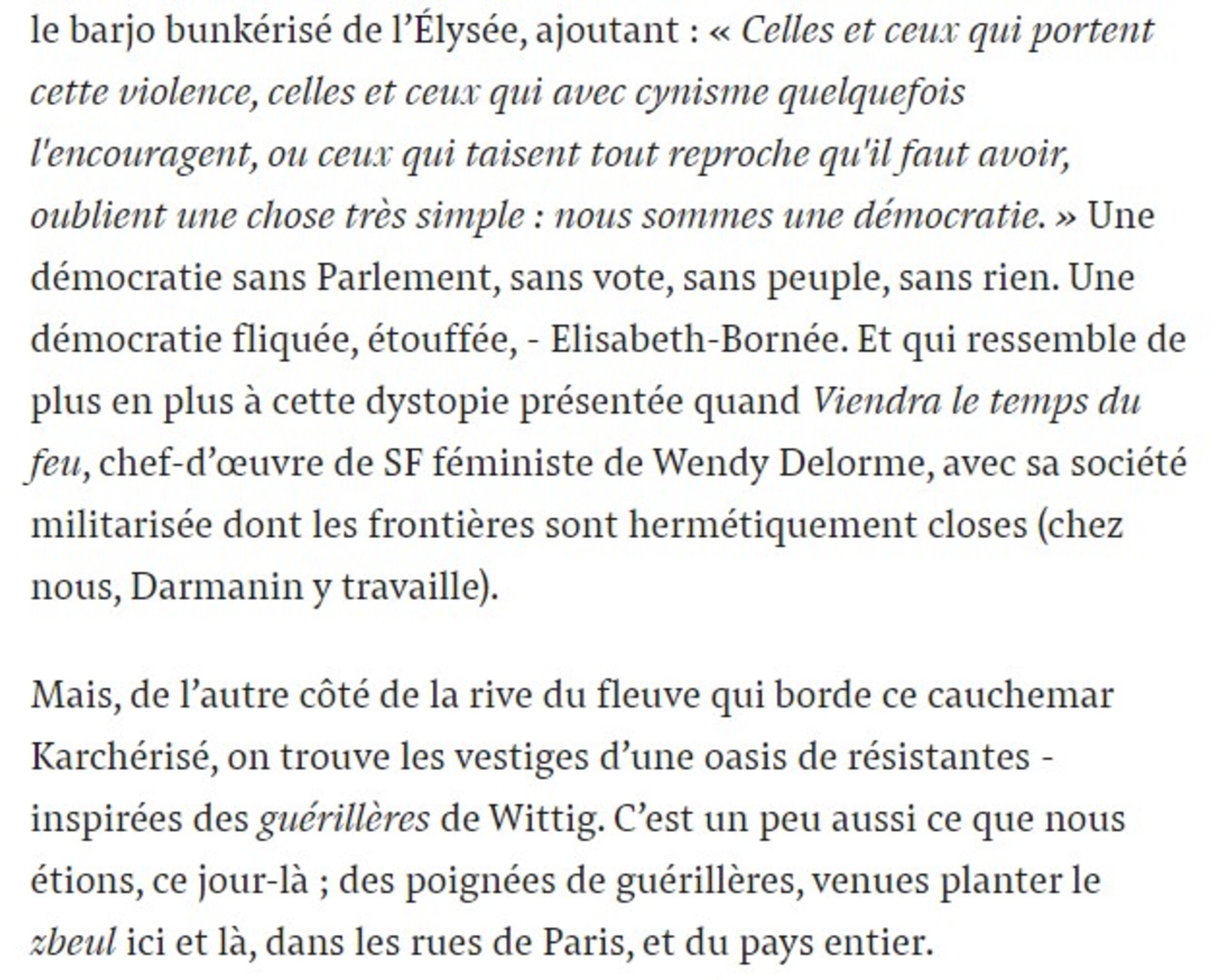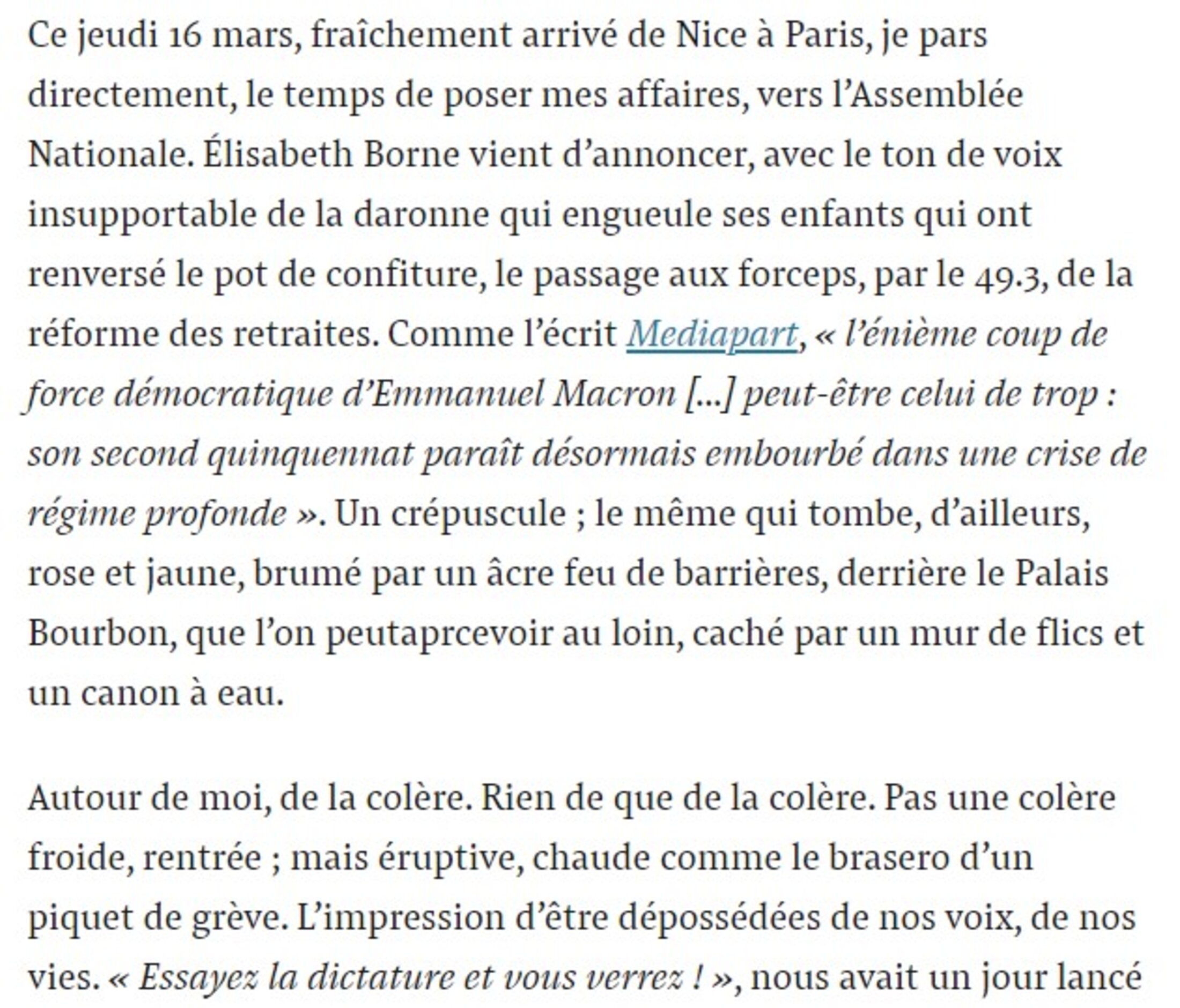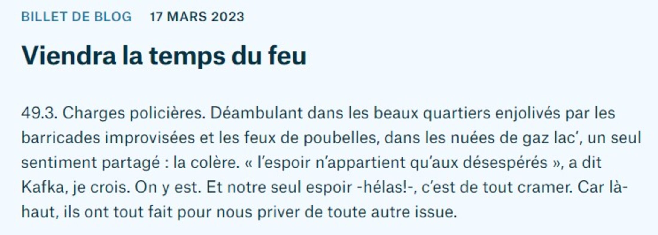 Mais je dois bien l’admettre aussi, je ne savais plus trop trouver les mots pour exprimer ma colère devant ce qui se passe en France et mon franc dégoût à l’égard de mes proches comme des plus lointains (dont je me fous évidemment), ces petits bourgeois de merde qui loin de s’indigner, trouveraient presque normal que l’on rajoute des années de travail à des pauvres bougres, alors qu’un peu partout, des monstres gagnent des fortunes sans riens branler ! Quant à tous ces vieux qui sont pour la retraite à 64 ans alors que certains l’ont prise bien plus tôt - ou jamais car pour eux seul le boulot compte! -, tous ces vieux qui votent Macron en louant sa jeunesse (belle jeunesse en effet !), qu’ils crèvent ! Et vous l’avez vu, j’ai décidé d’être poli !