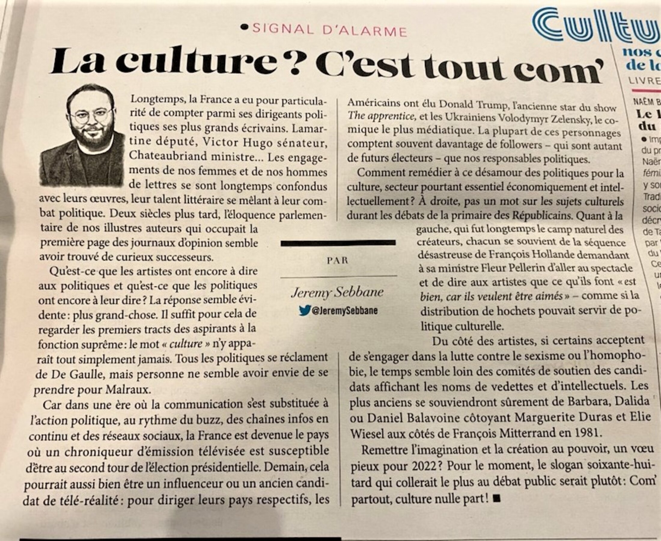 Admirateur du premier ministre de la Culture, j'ai évidemment beaucoup apprécié cette fine observation de l'auteur de cet article, qui déplore que tous les candidats se réfèrent sans cesse à de Gaulle, mais jamais à André Malraux. Et de là m'est venue une idée - que je développerai sûrement un jour - qui peut paraître absurde ou dérisoire. On devrait militer pour une dictature de la culture. Cela changerait évidemment des camps russes, chinois ou coréens. Au lieu de la rééducation par la prison entre quatre murs ou des travaux forcés dans les mines ou dans les ateliers de confection, on enfermerait les récalcitrants dans des bibliothèques.