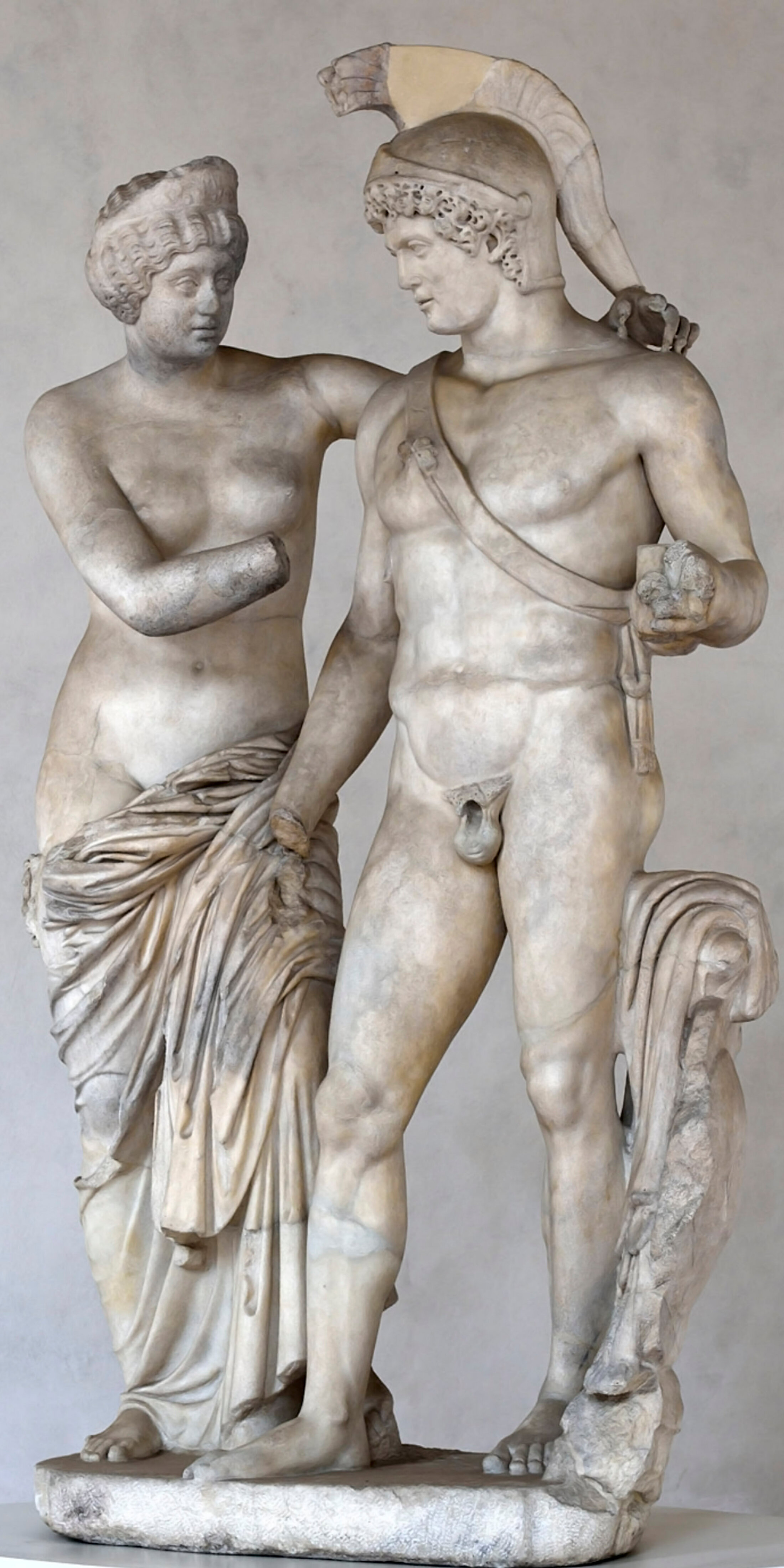 Le groupe en haut et droite se trouve à la galerie Borghèse. Il offre un Cupidon et un gros étai entre les deux protagonistes. Les deux Mars portent le casque, mais l’épée reste dans le fourreau chez le premier alors qu’elle se voit dégainée dans l’autre qui porte en plus un bouclier.