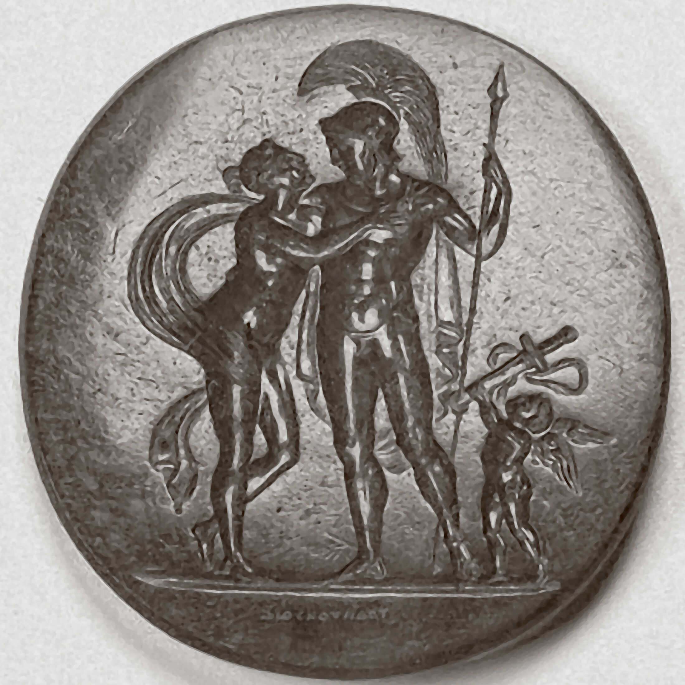 J’ajoute à la liste des Vénus et Mars une intaille antique. Travaillée en creux pour un cachet, elle apparaît par une illusion optique comme un bas-relief. Certes l’artiste a pris quelques libertés avec les jambes de Vénus, tout en préservant la gauche pliée, mais il est curieux de constater qu’ici Cupidon ne soutient pas de bouclier, mais tend les armes à Mars dans la même attitude...