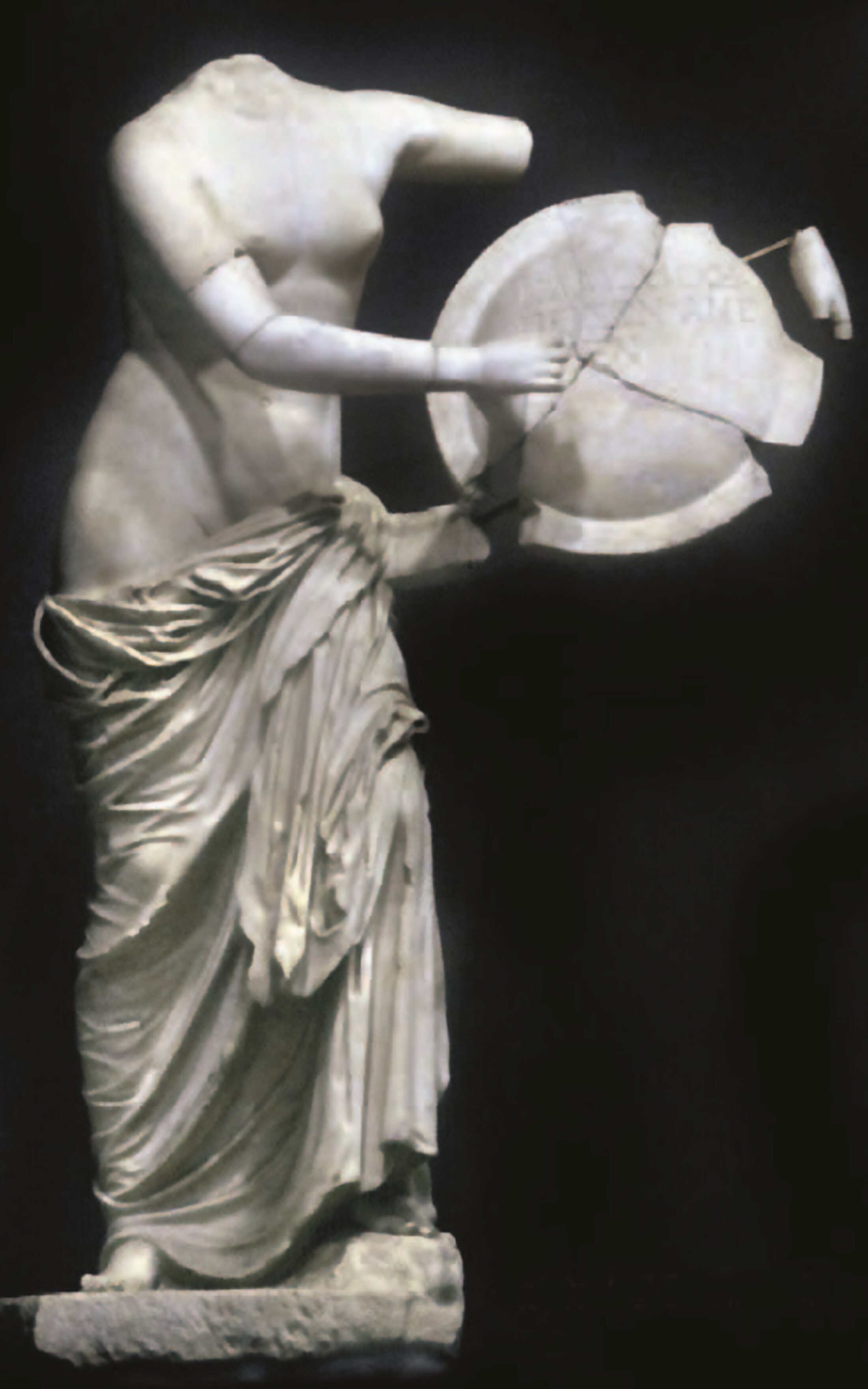 Maintenant, pour enrichir notre interrogation, jetons un coup d’œil sur la Victoire de Brescia. Elle fut découverte en 1826, soit six années seulement après la Vénus de Milo. Ailée, vêtue, avec surtout ses bras intacts, la statue de bronze paraît de haute qualité, mais pas aussi merveilleuse que la Vénus de Milo, dois-je le redire. Sa main gauche tourne dans l’autre sens que celle de l’Aphrodite de Capoue pour maintenir… mais quoi donc ?