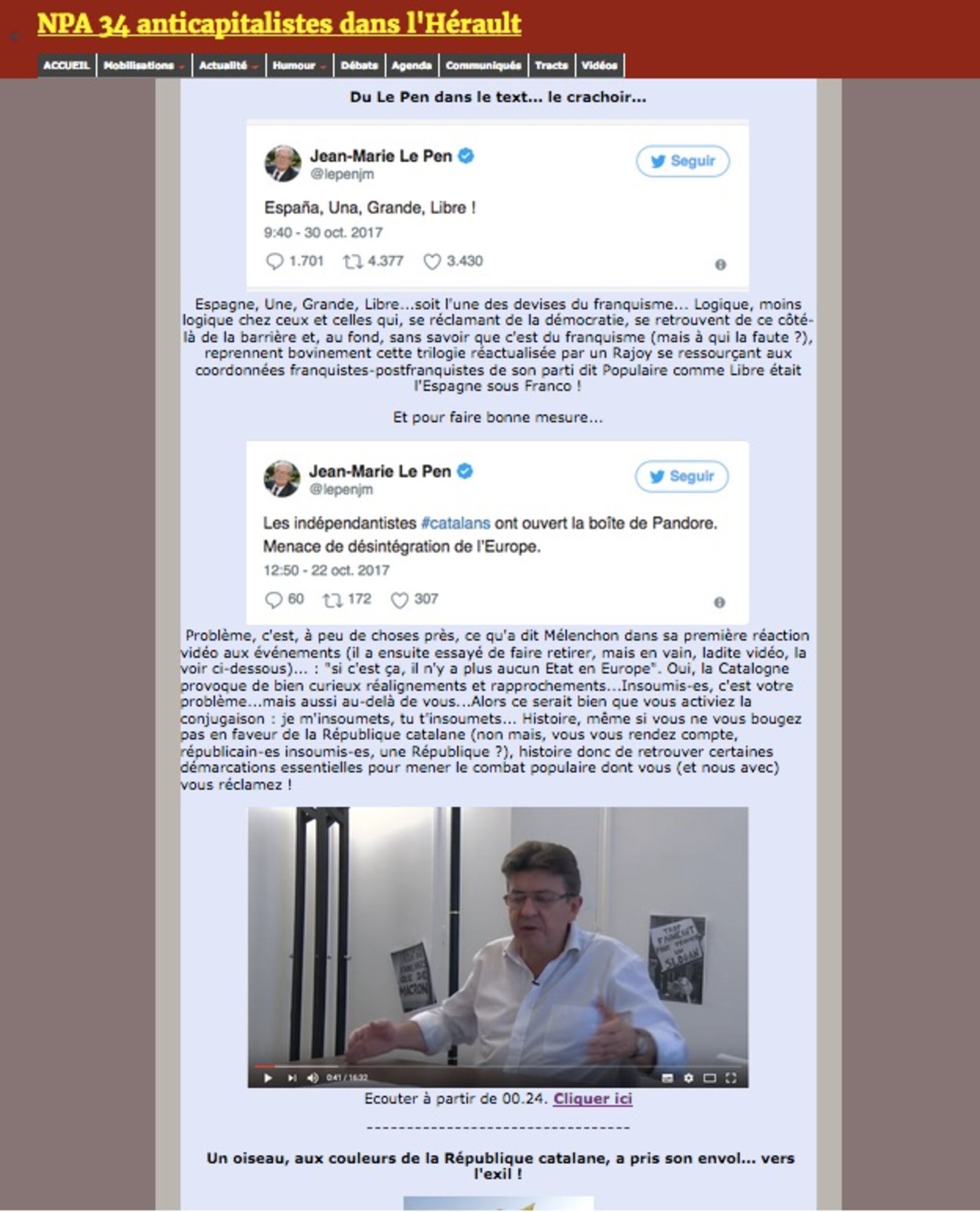 D'abord, ils prennent deux Tweet sur la Catalogne, émanant de Le Pen, patriarche fasciste de référence, pour tenter d'en amalgamer le contenu avec une soit-disant mystérieuse vidéo de Mélenchon, que ce dernier aurait tenté en vain de faire disparaitre, tant elle devait être compromettante...