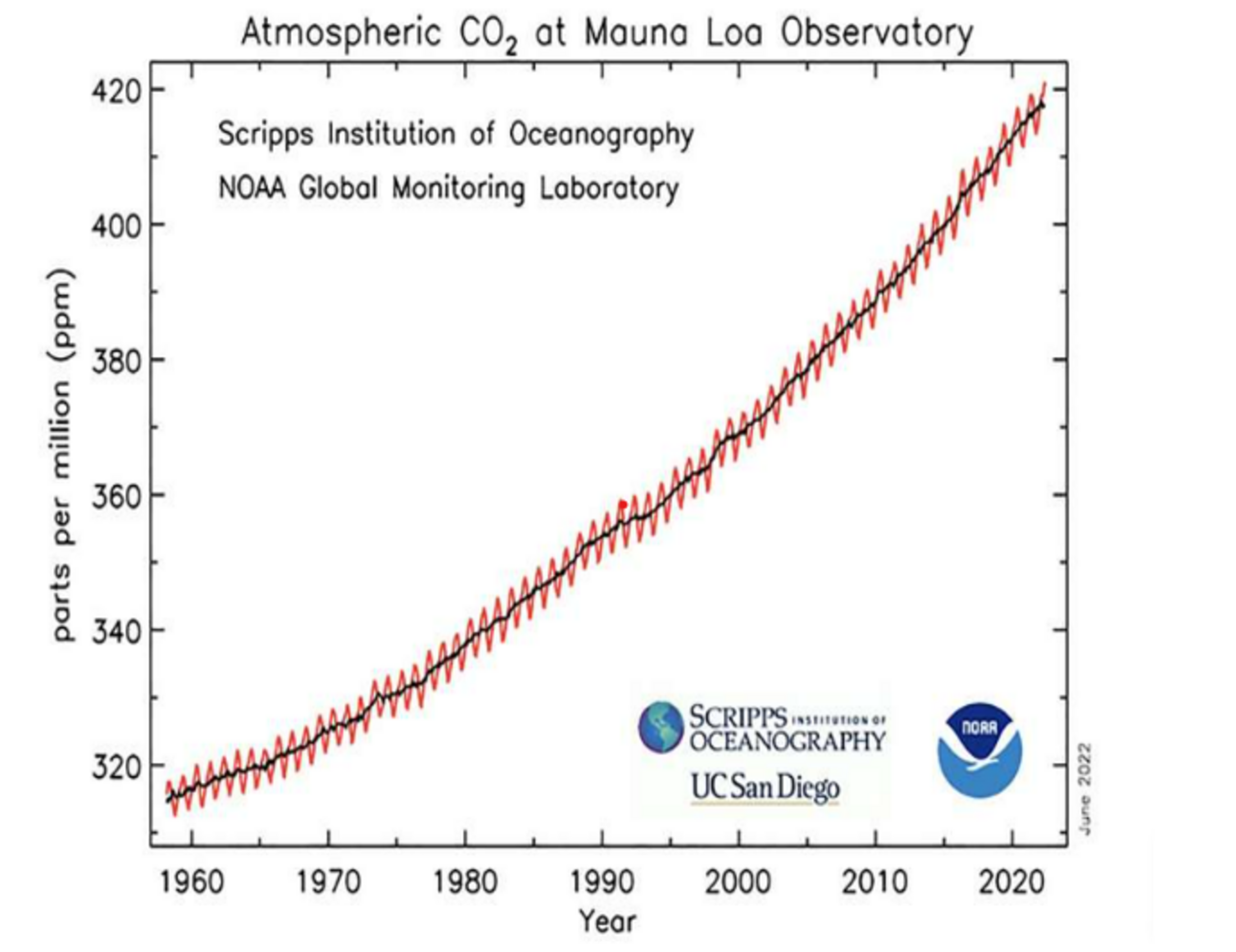 Avec une concentration de 414,7 partie par million (ppm) de CO2 relevée en 2021 à l’observatoire du Mauna Loa à Hawaï, a en effet été atteint le niveau le plus élevé depuis « au moins le dernier million d'années ». Alors qu’il était resté stable autour de 280 ppm pendant plus de 6.000 ans, son évolution récente a été fulgurante ; en deux siècles de révolution industrielle, pas moins de 1,5 milliard de tonnes de CO2, dont la durée de vie est de l’ordre du siècle, ont été émises dans l'atmosphère.