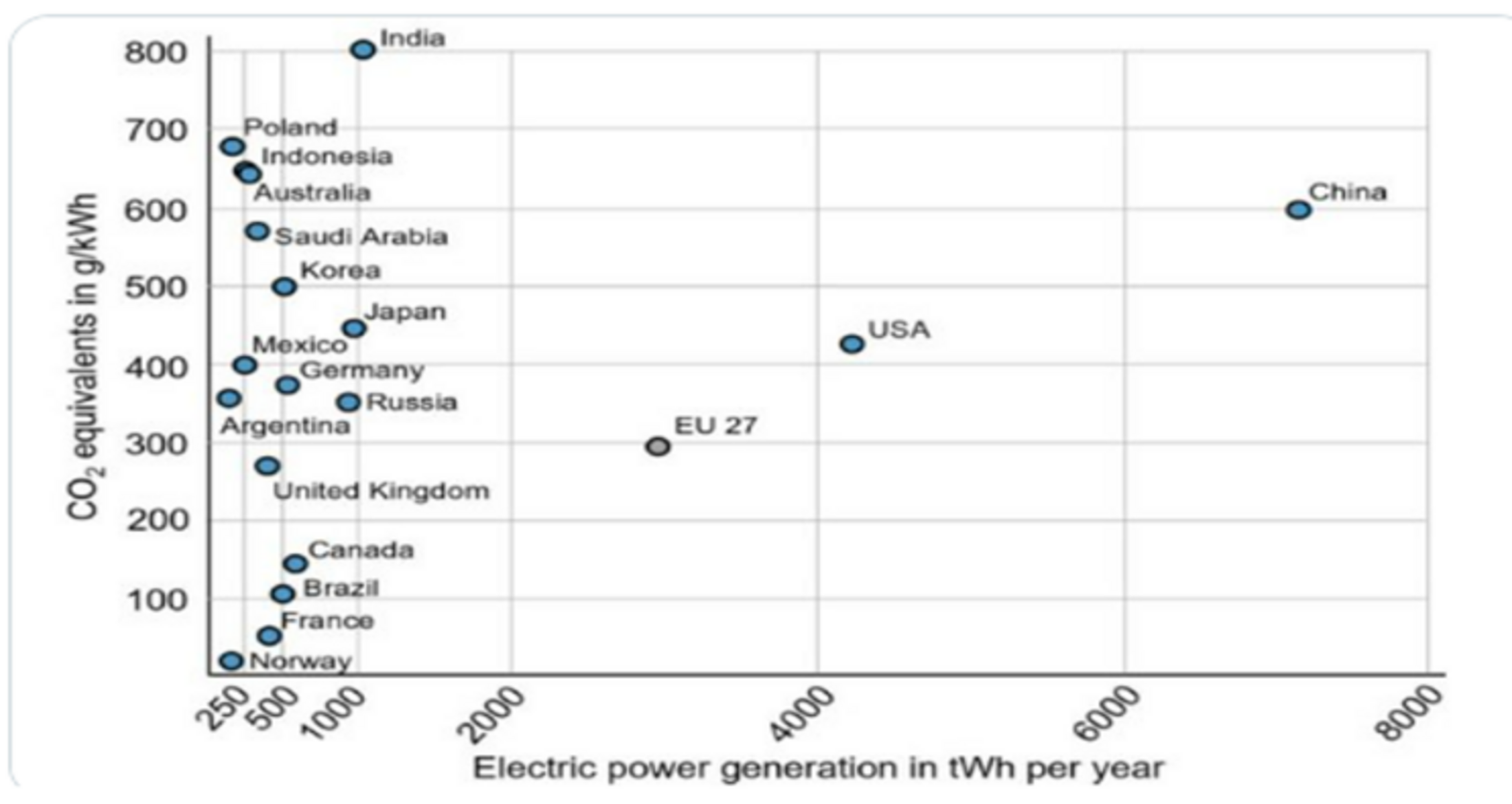 Pour prendre les deux situations les plus extrêmes dans le monde, qu’y a-t-il en effet de commun entre l’Inde et ses 800 gCO2/kWh, dus à une utilisation massive du charbon dans son mix électrique, et la Norvège qui, avec 92% d’hydraulique et près de 6% d’éolien, émet de l’ordre d’à peine plus de 20 gCO2/kWh[1] pour produire son électricité?
