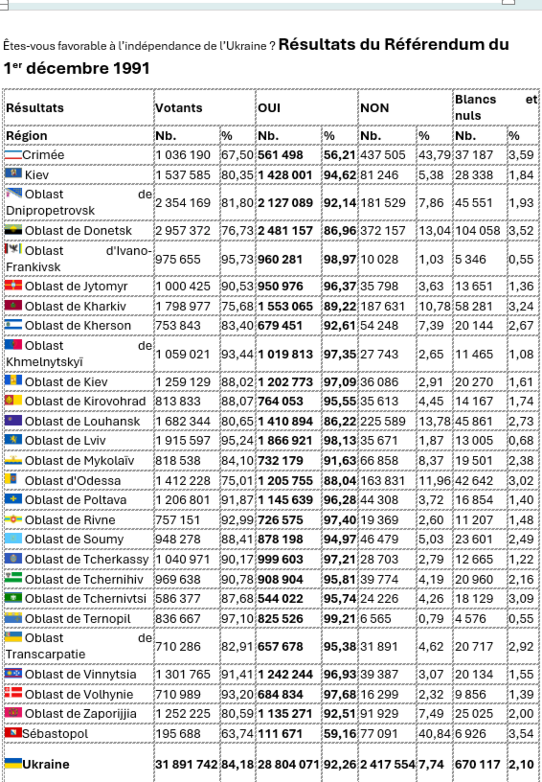 Cyniquement Mélenchon fait référence à la position du peuple ukrainien, mais quand elle s’exprime il n’en tient aucun compte : voir ci-dessous les résultats du référendum tenu au sein de l’URSS en 1991 qui montrent que, Donbass et Crimée inclus, tous les oblasts ont voté pour l’indépendance.