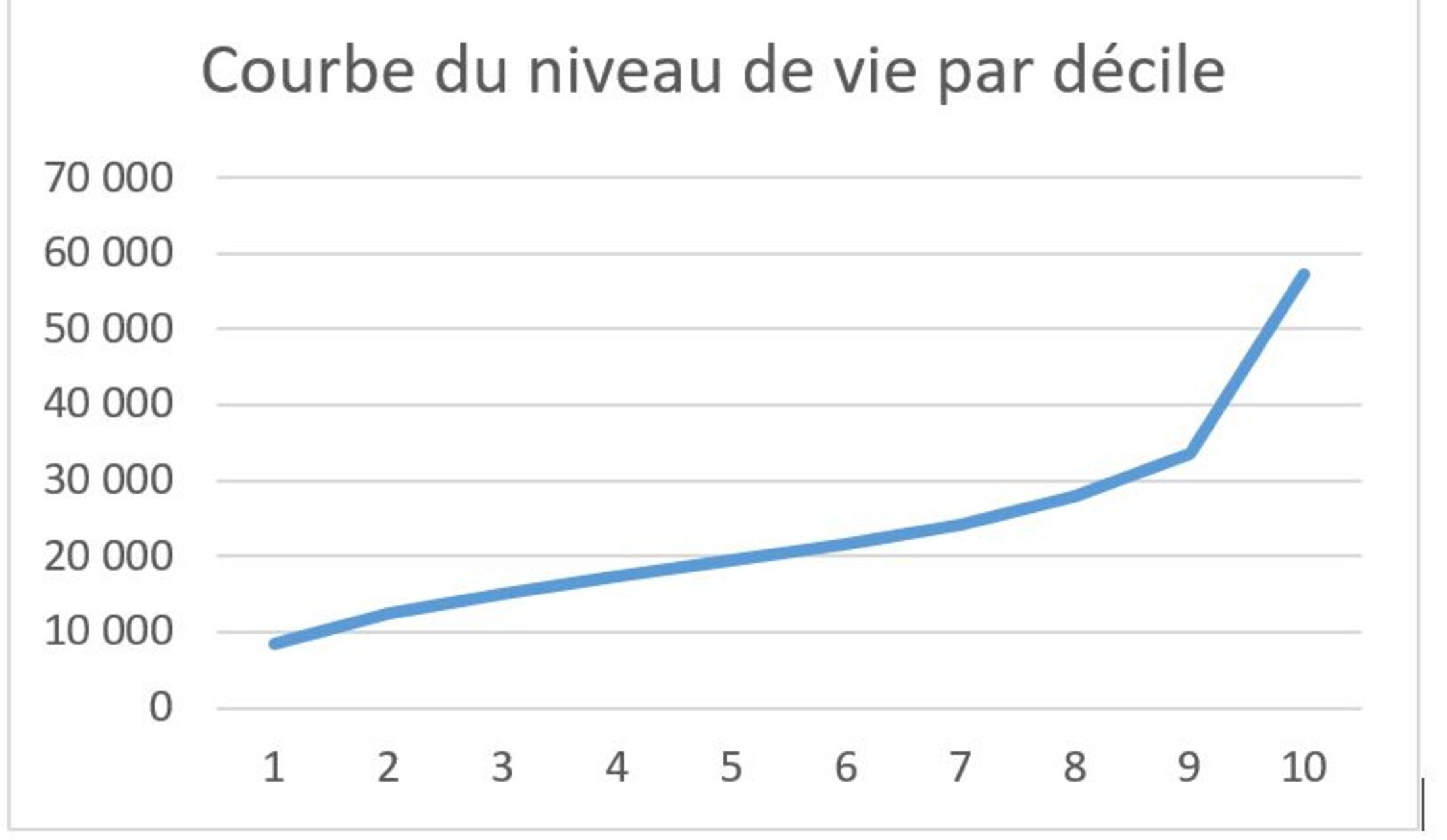 La courbe issue du graphique précédent montre que quelque chose d’exceptionnel se passe dans le 10ème décile, car le revenu moyen qui grimpait régulièrement de 10 à 20% par décile fait tout à coup un bond de plus de 70% du 9ème au 10ème décile (de 2794€ à 4776€ en moyenne par mois). Le dernier décile (les 10% les plus riches) rompt la courbe de progression relativement linéaire.