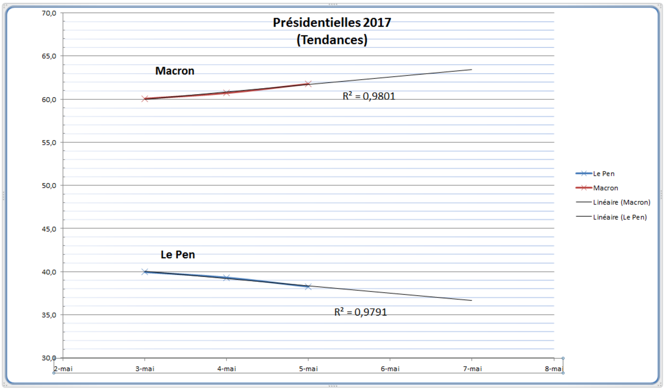 Pour le premier tour j'ai analysé graphiquement les sondages quotidiens publiés puis extrapolé ces données au jour du premier tour. Au final cette méthode personnelle s'est bien approchée du résultat final avec un écart de 0,7 point seulement en moyenne pour les cinq principaux candidats. Aujourd'hui, j'améliore et j'applique ma méthode. Elle montre Macron gagnant à 63% et Le Pen à 37%.