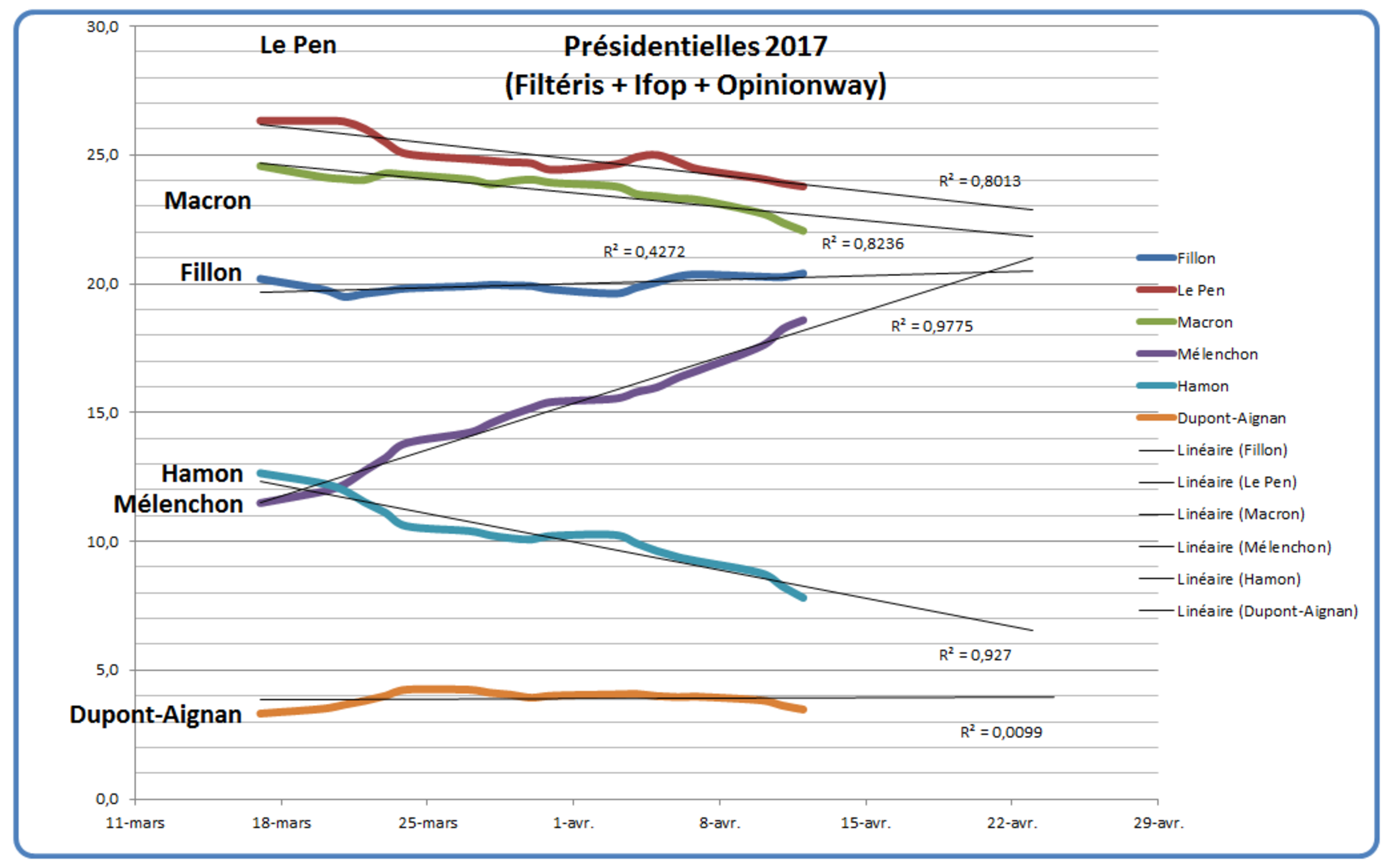La croissance de Mélenchon continue presque en ligne droite depuis le 17 mars. Sa droite de régression pointe vers 21% le 23 avril et la qualité de cette prédiction statistique est excellente avec un coefficient de détermination R2 supérieur à 97%. Ce n'est qu'une extrapolation à partir de la situation d'aujourd'hui et donc cela peut changer avec des événements nouveaux (déclarations, débats, etc). La qualité de cette régression est à double tranchant pour Mélenchon car cela voudrait aussi dire qu'il ne pourra pas aller bien au-delà de 21% ou 23% si la marge d'erreur est de 2% et si elle est en sa faveur. Pour avoir une chance raisonnable de figurer au second tour il lui faudra que Le Pen ou Macron ou les deux continue(nt) leur(s) descente(s).