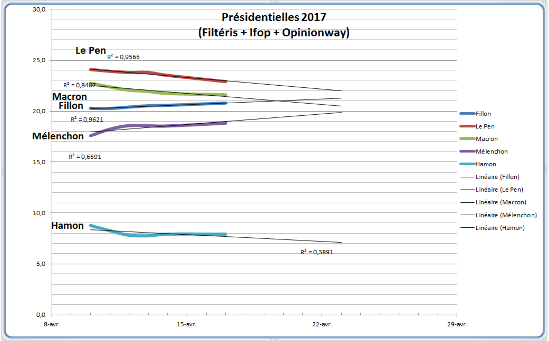 Mélenchon a repris une petite croissance après son palier inquiétant de ces derniers jours. C'est méritoire car cette petite croissance ne se fait pas au détriment de Hamon qui confirme lui son palier, palier qui a tout l'air d'être un plancher aux environs de 8%. Les trois condidats en tête en ce moment ont des évolutions plus stables avec un R2 de qualité pour Le Pen (en tête maintenant et dans la projection au soir du 23 avril mais elle suit une descente régulière) et pour Fillon un R2 aussi de qualité (montée régulière depuis le 3 avril).