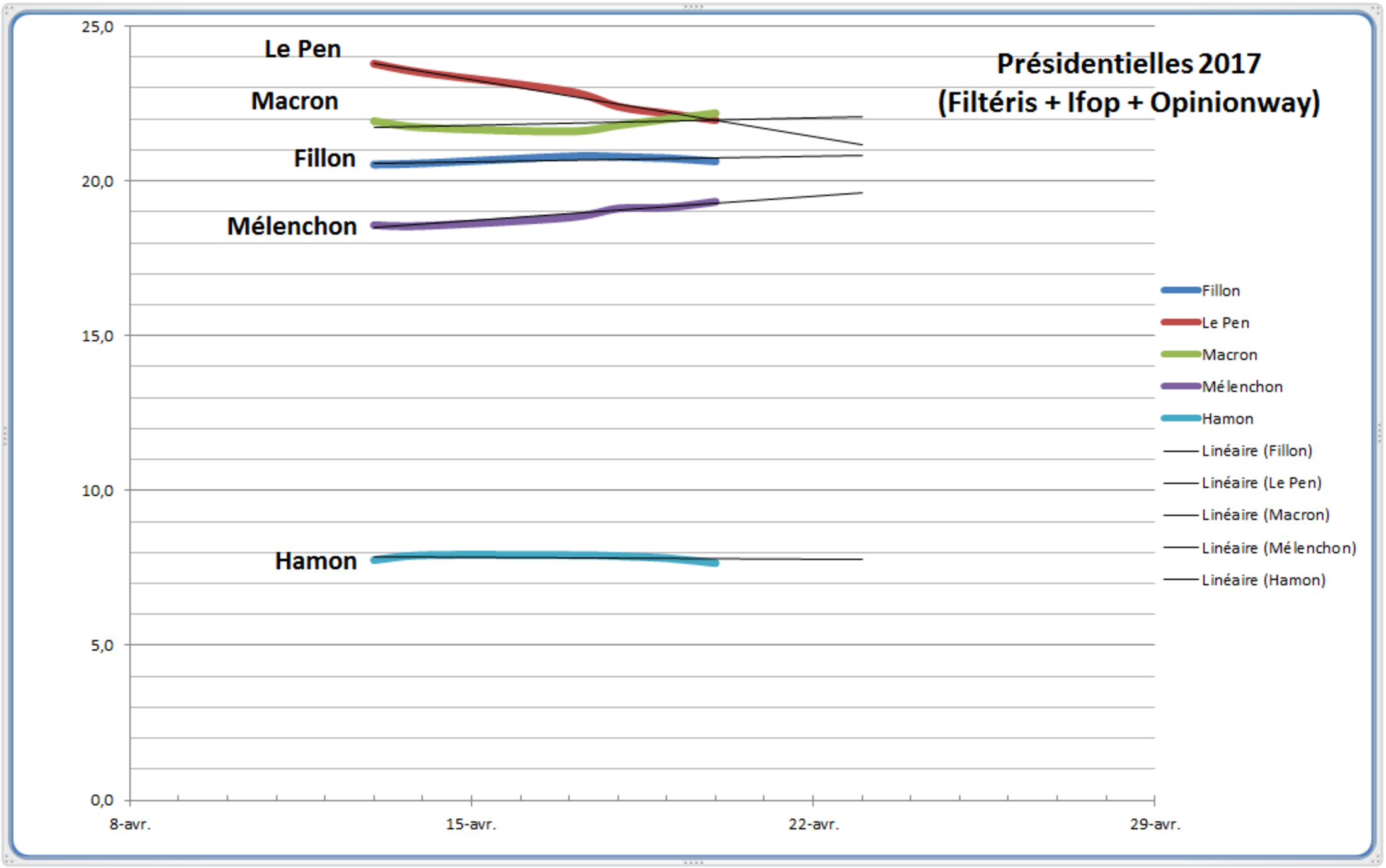Mon extrapolation donne Macron, Le Pen, Fillon et Mélenchon dans cet ordre dans un intervalle de moins de trois points ce dimanche. Cet intervalle est de l'ordre de la marge d'erreur statistique et sondagière que Nate Silver estime en général à 3,5 points. Donc ma conclusion est que ces données ne nous permettent pas de se faire une idée de qui sera au second tour.
