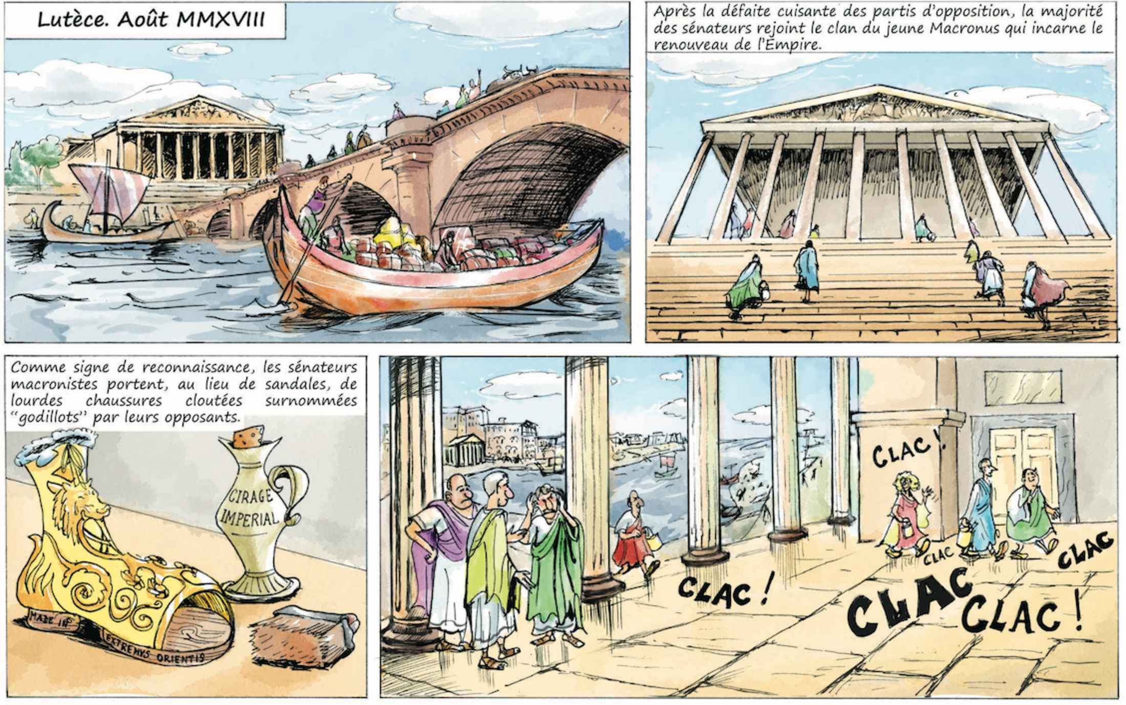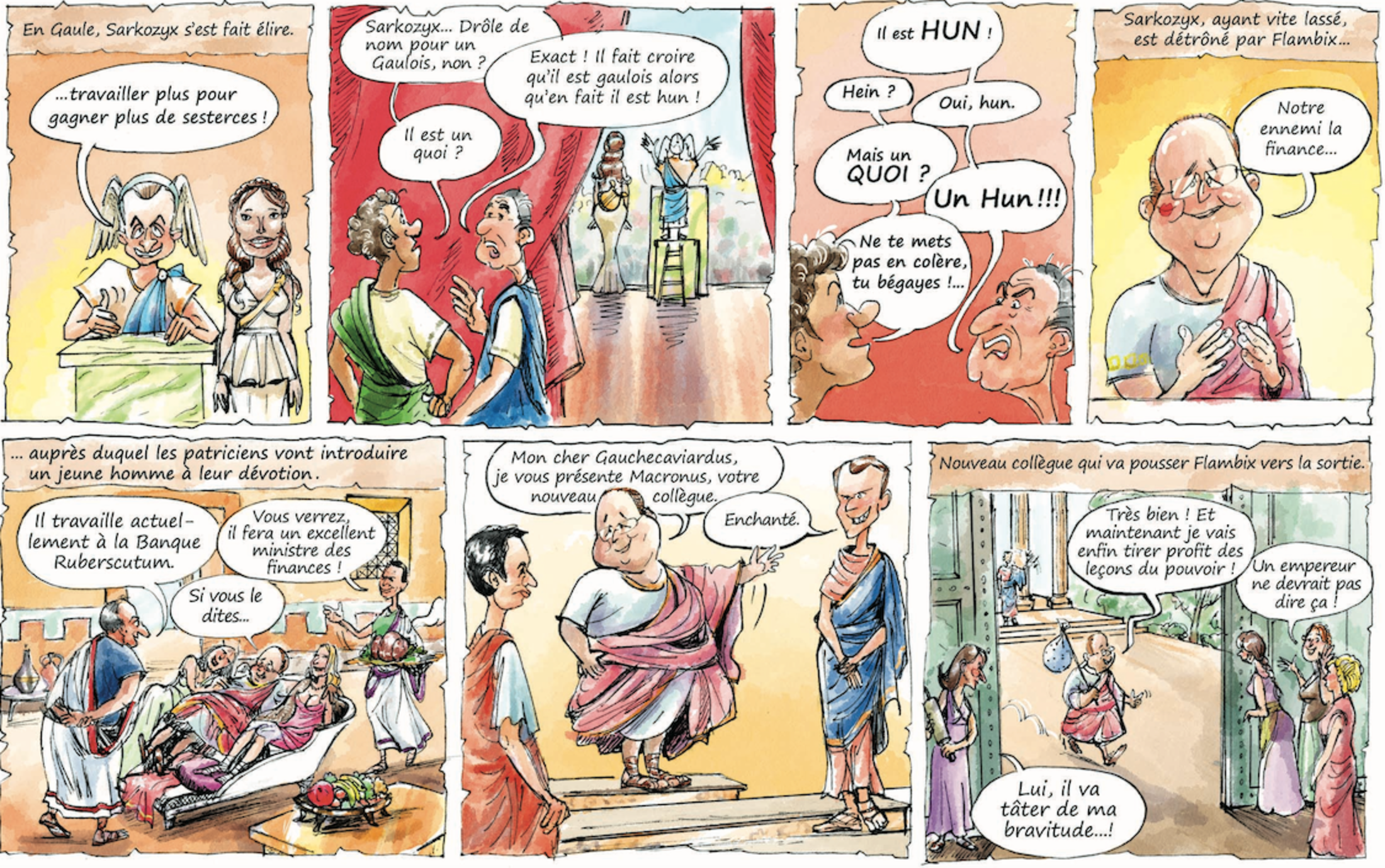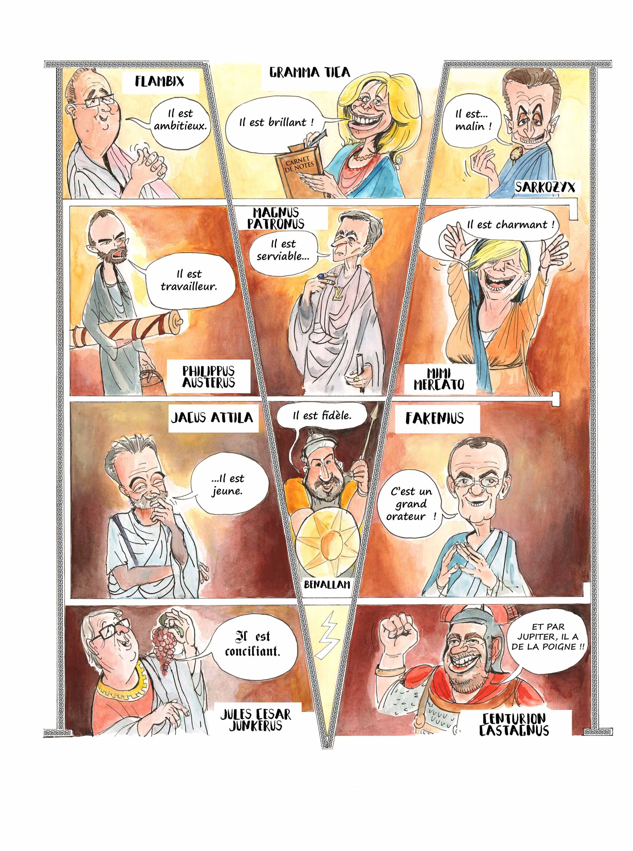 On y retrouve les personnages-clé du mouvement : de Benallam à Théorieducomplix (Maxime Nicolle), de Castagnus (Castaner) à Colérix (Mélenchon) et Blonde de Neuillix (Marine Le Pen), sans oublier Consensus (Bayrou), médiateur fort encombrant ou Sarkozyx, "mauvais génie" de César.