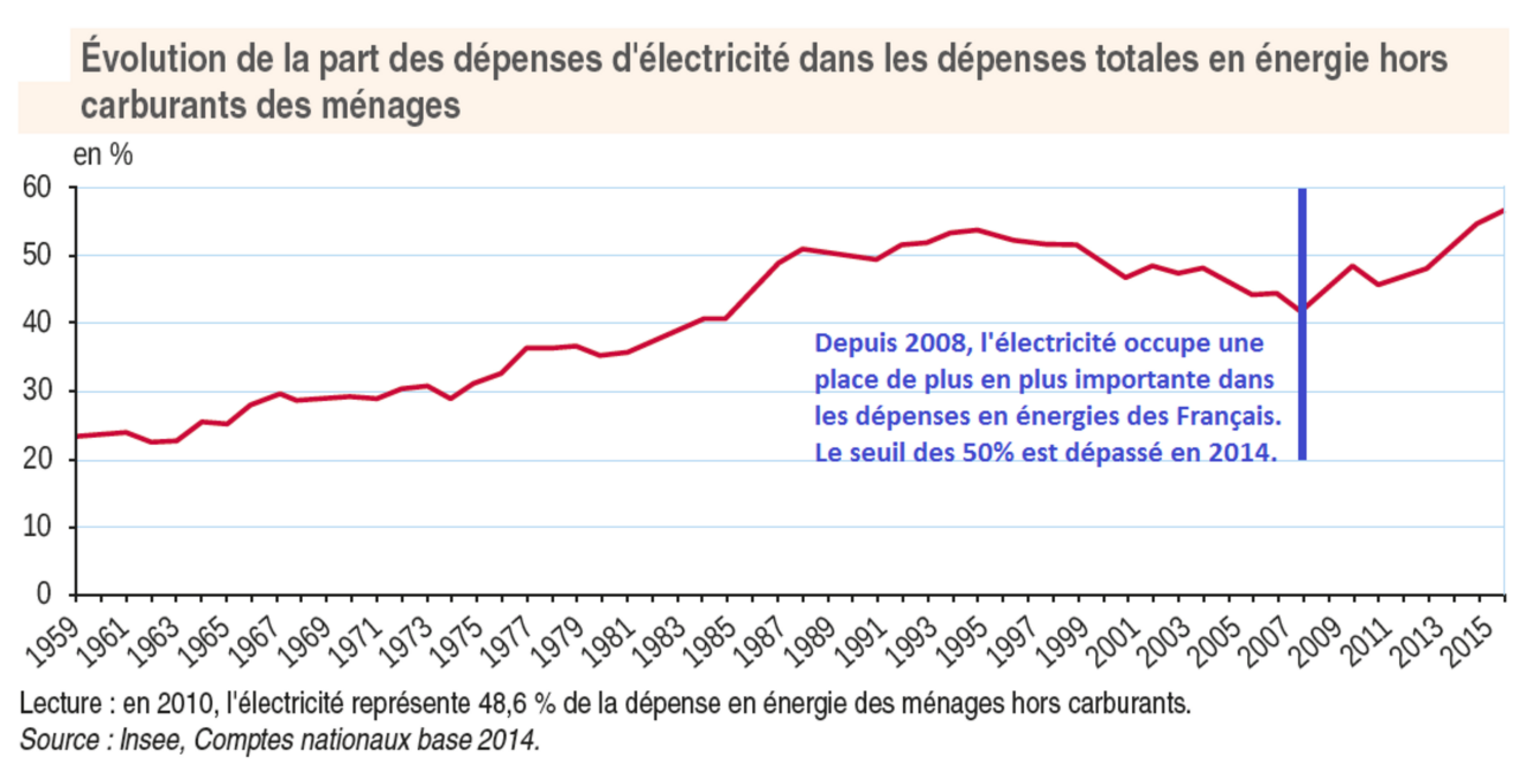 Dans le détail, l'électricité représente 57% des dépenses en énergie (hors carburant) des ménages, contre 24% en 1960.