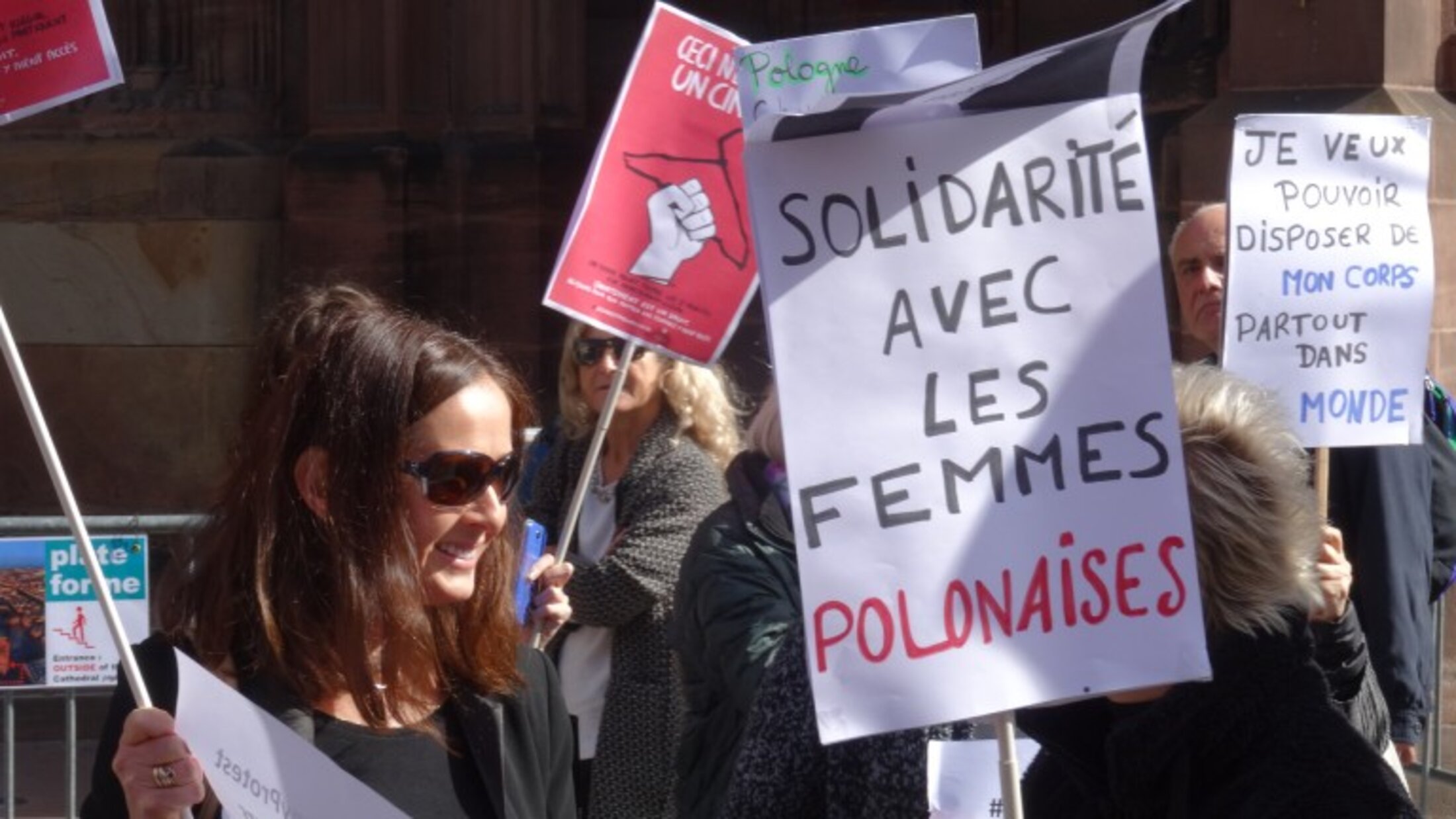 Un rassemblement de 150 personnes à l’appel de Polonaises de Strasbourg soutenues par le Planning familial s’est tenu à partir de 12 h 30 devant ce lieu symbolique qu’est la cathédrale.