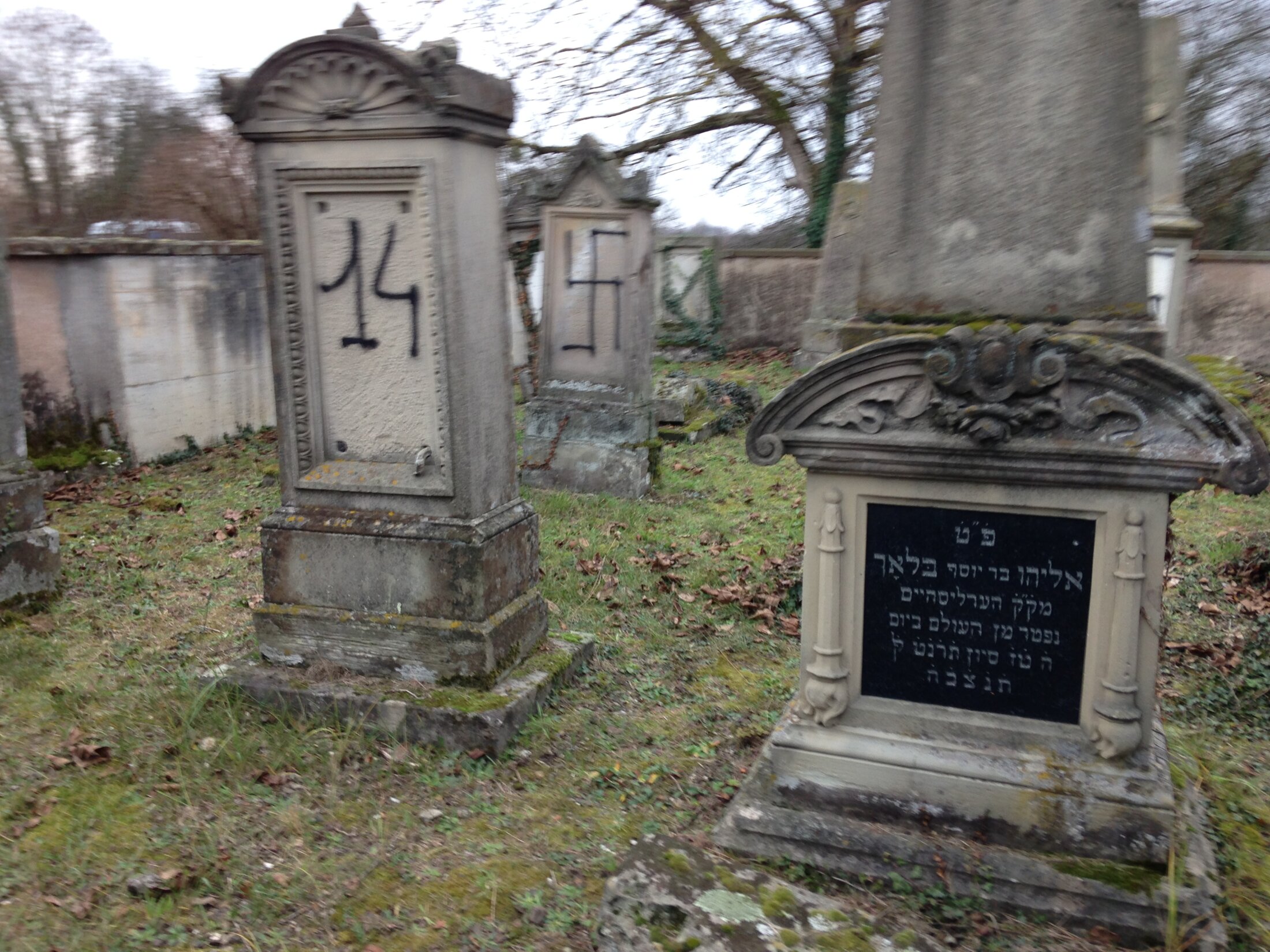 Tous les journalistes font un demi-cercle à l’entrée du cimetière pour l’arrivée de Castaner. Il est accompagné de gardes du corps et de personnalités qui se dirigent vers les stèles dont celle, souillée aussi, des déportés. Il se recueille, touche la pierre, dépose un caillou, selon la tradition juive en compagnie du rabbin.