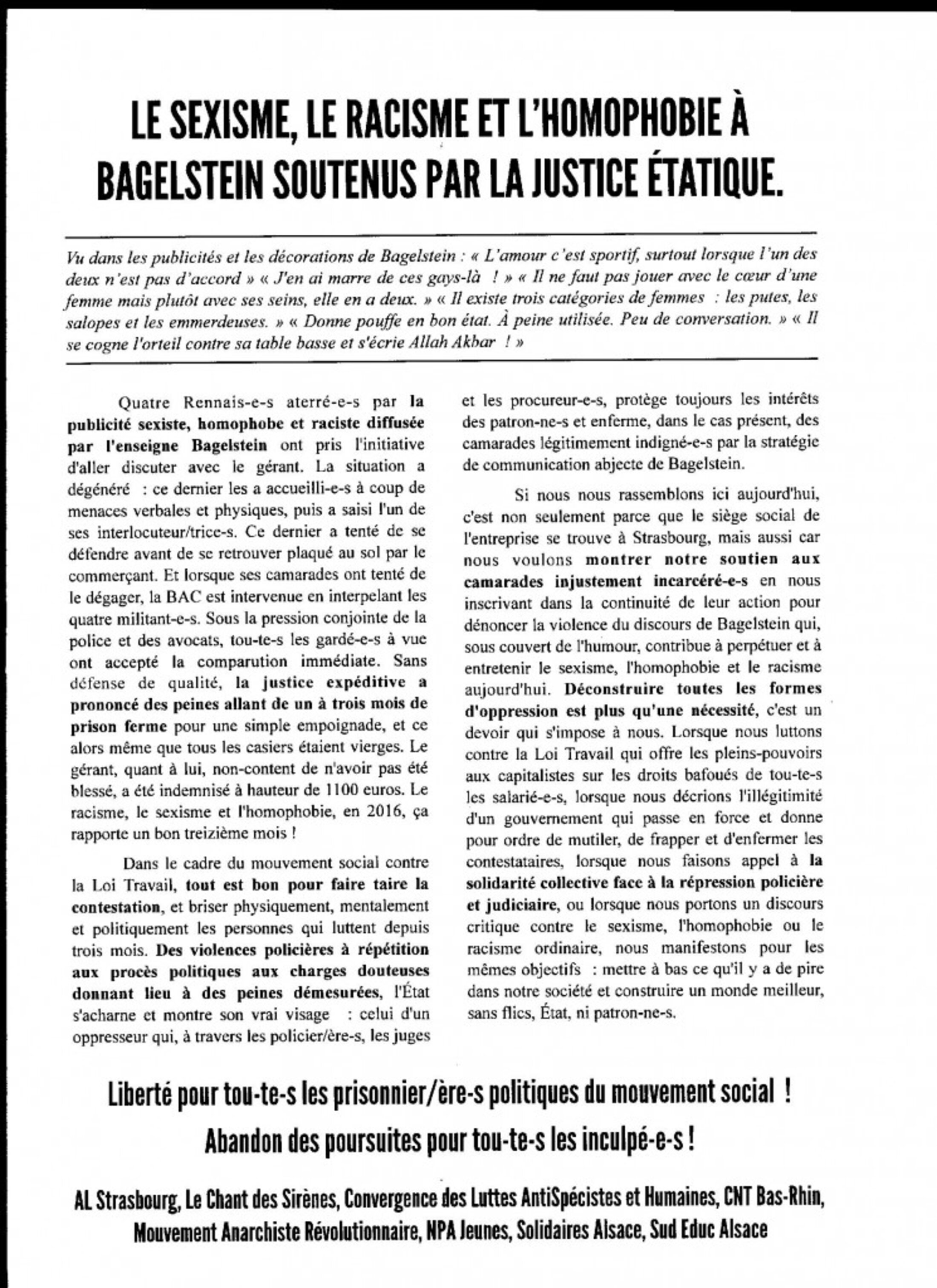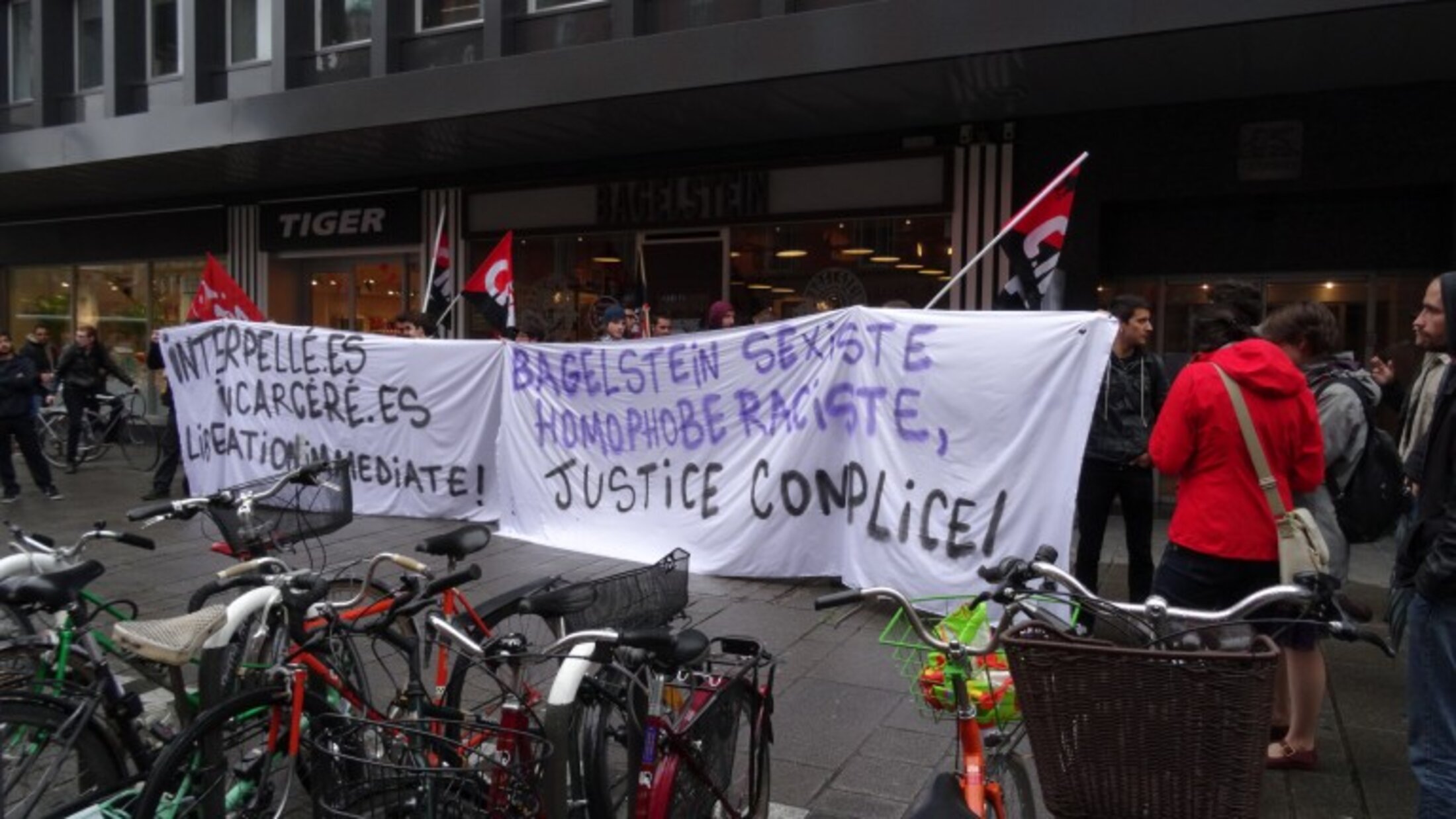 Plusieurs dizaines de personnes se sont rassemblées ce jeudi de 12 à 14 h devant Bagelstein à Strasbourg pour protester contre le sexisme le racisme et l’homophobie soutenus par la justice étatique qui au lieu de condamner le patron de cette boite à Rennes a condamné des manifestants!