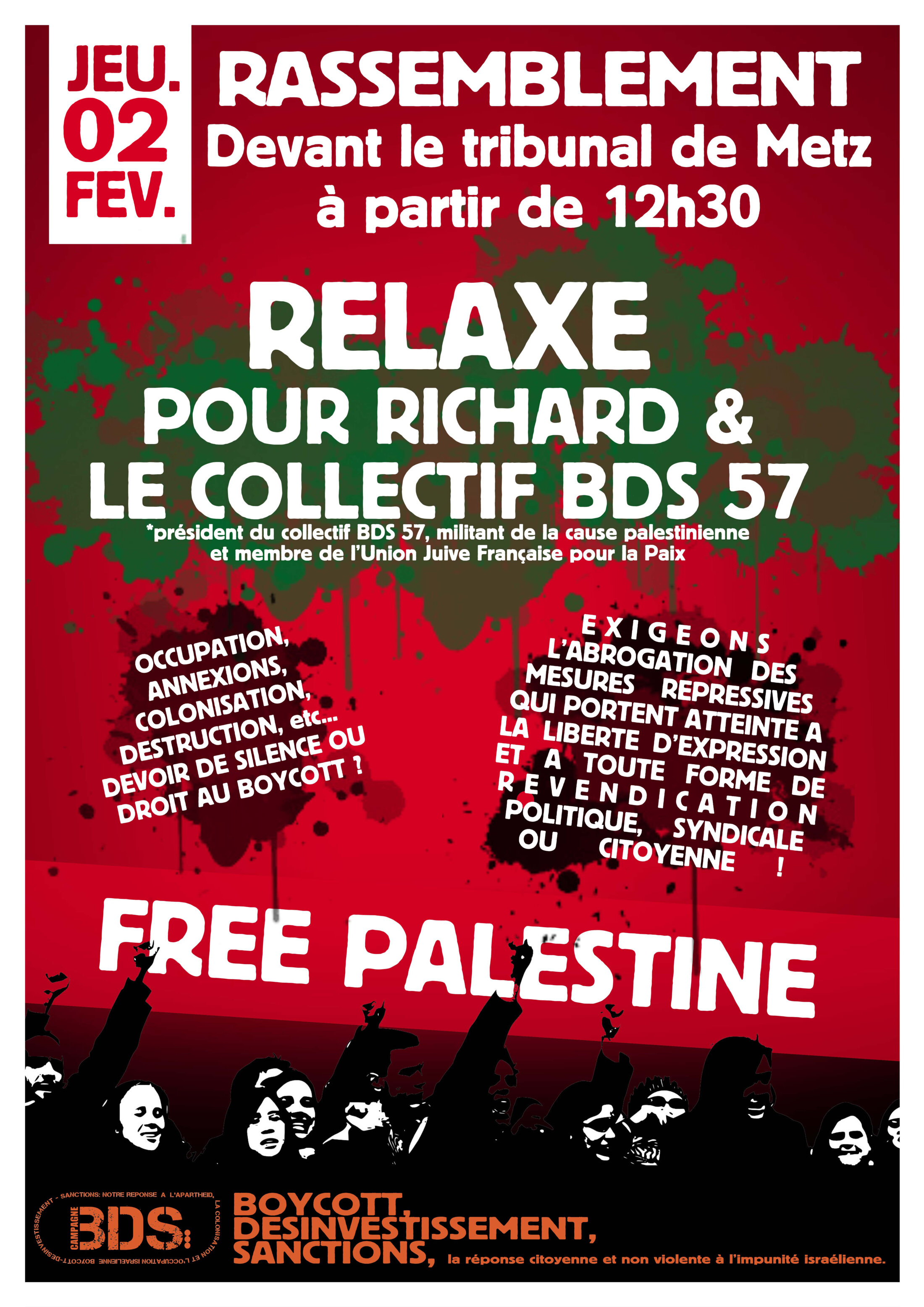 Relaxe pour Richard, président du collectif BDS 57, militant de la cause palestinienne et membre de l’Union Juive Française pour la Paix !
