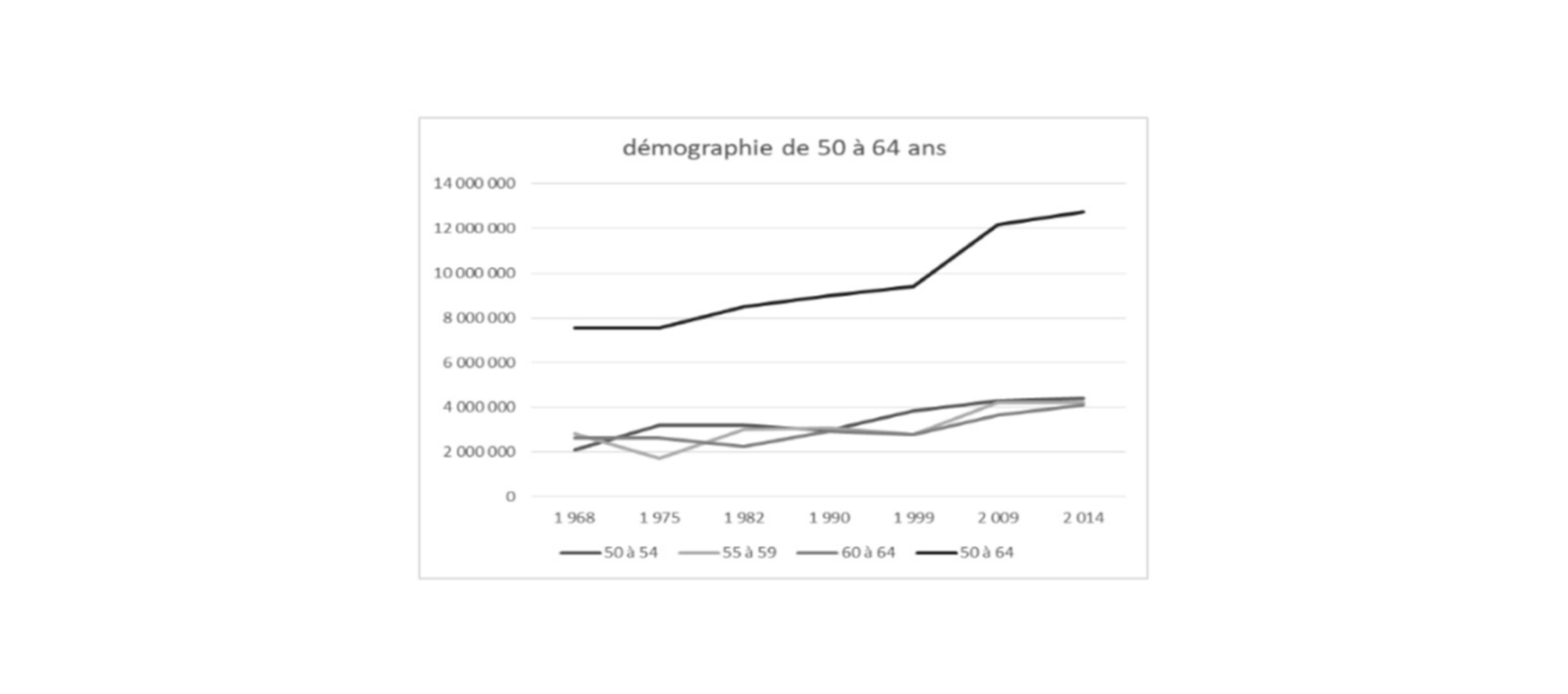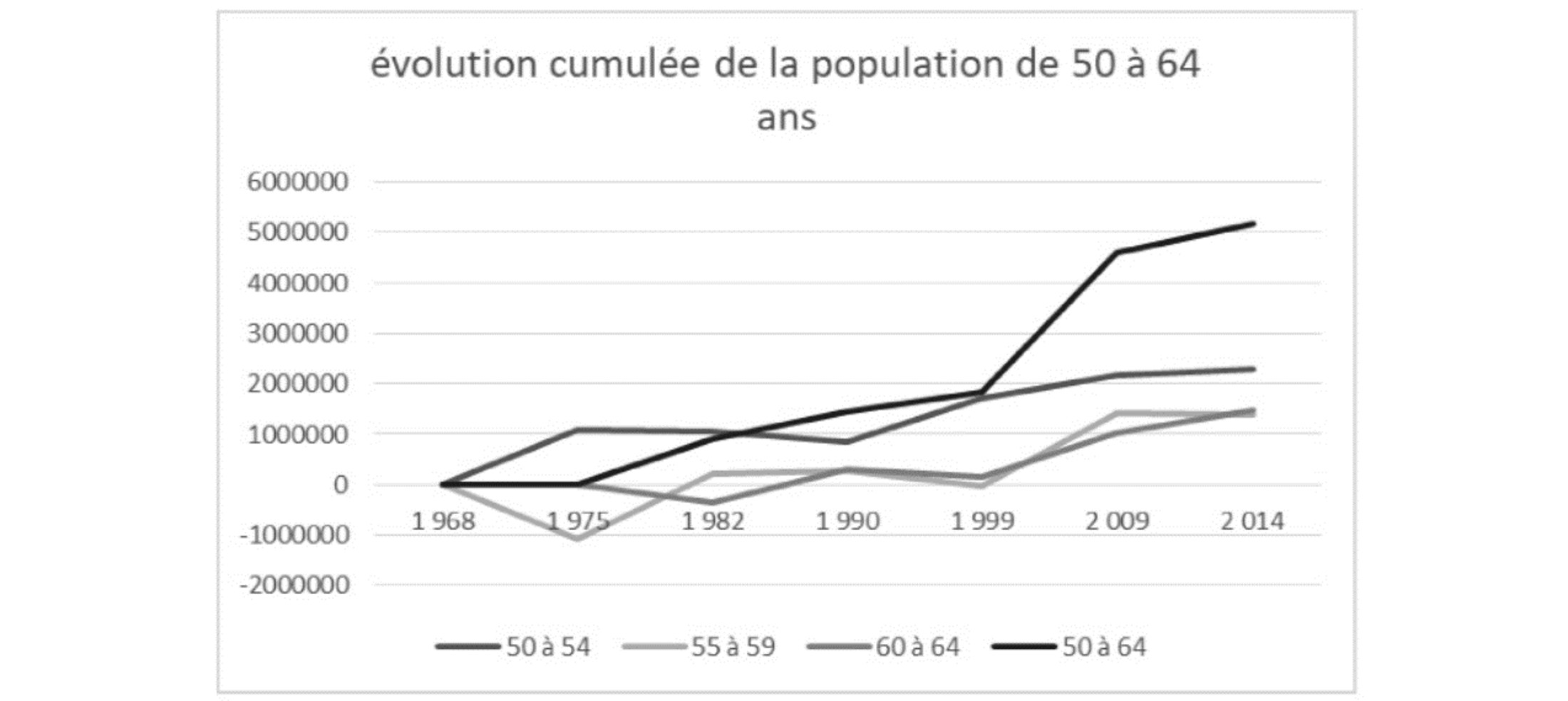 L’évolution de la population des 50-65 ans est à l’opposé de celle de la classe d’âge des 15-24 ans. En effet, son augmentation est constante, depuis 1968. Elle passe de 7,5 millions de personnes à 12,7 millions, avec des variations selon les quintiles. Ainsi, les enfants nés entre 1921 et 1924, ayant subi la deuxième guerre mondiale à l’âge d’être militaires sont-ils remarquablement peu nombreux (1,7 million) à avoir atteint la soixantaine en 1975, alors que les « baby-boomers » sont pratiquement deux fois plus nombreux à y arriver en 2009 et 2014.