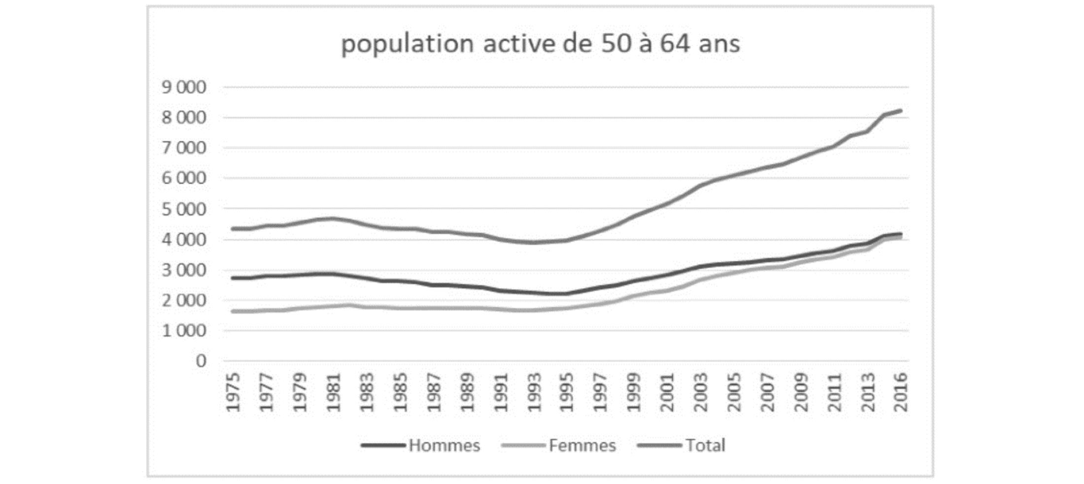 L’emploi des 50-64 a donc diminué pendant 16 ans, pour ensuite augmenter rapidement. Globalement cette population active est passée de moins de 4 millions en 1975 à plus de 7,5 millions en 2013, puis 8,2 millions en 2016.