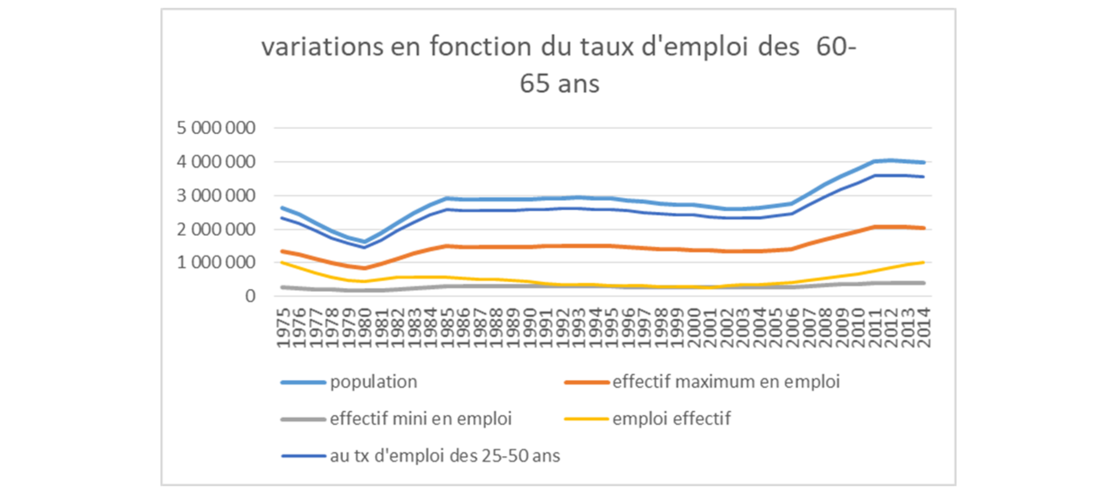 En reprenant l’évolution démographique, la population active, en 2014 aurait été de 3,5 millions de personnes avec le taux d’activité des 25-49 ans, soit +2,5 millions de personnes par rapport à l’emploi effectif, de 2 millions avec le taux d’emploi masculin des années 1975, soit +1 millions de personnes, et de 0,4 millions avec le taux d’emploi minimal pour la tranche d’âge, soit -0,6 millions de personnes. Ces projections permettent des comparer l’impact des politiques de recul de l’âge de la retraite sur l’emploi, et partant, d’évaluer le chômage induit par ces mesures.