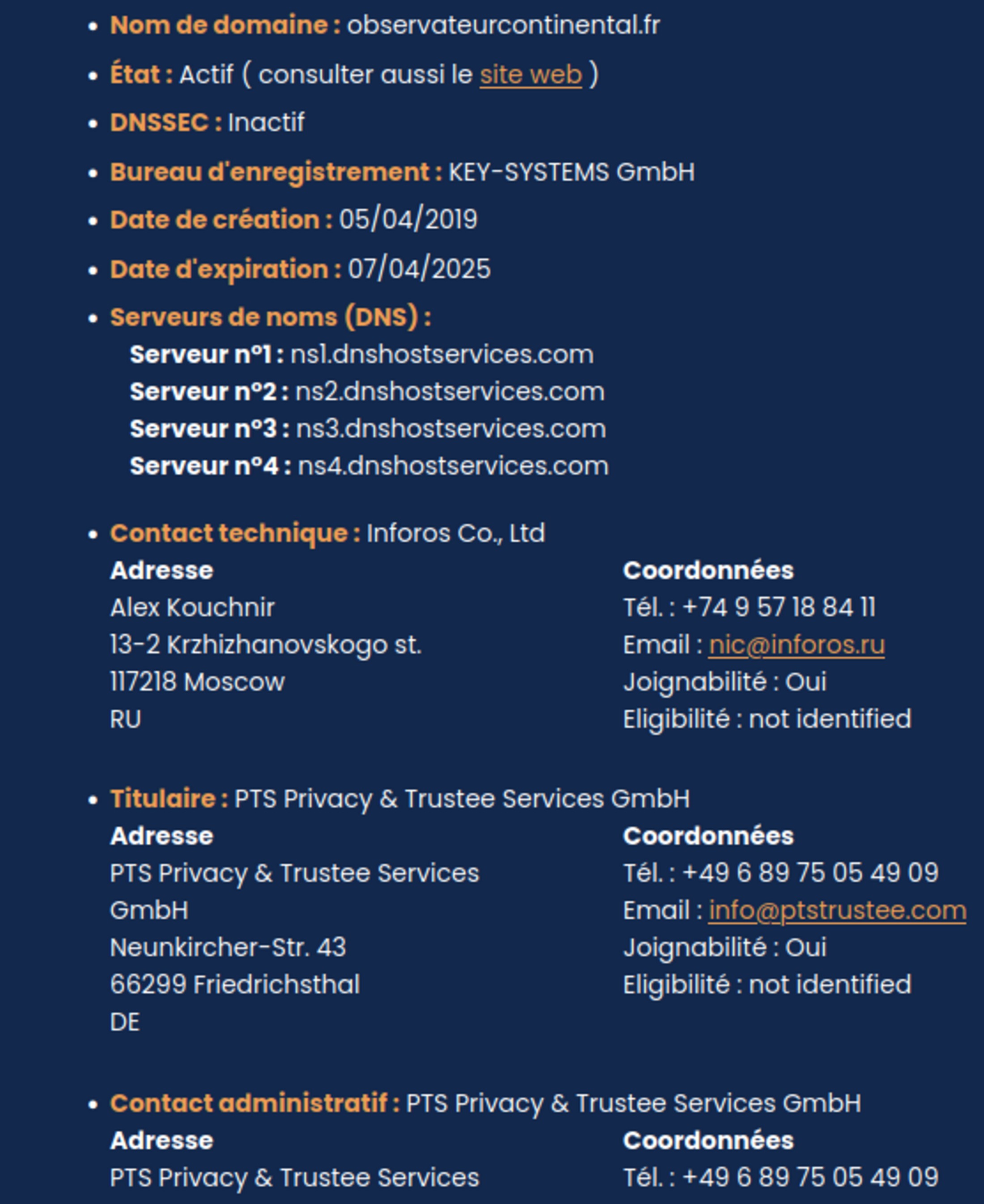 Les services du renseignement militaire russe se sont probablement aperçus en 2024 qu’ils avaient fait une bourde en faisant figurer l’agence de presse Inforos en clair sur les données officielles du site observateurcontinenral.fr. Le 15 janvier 2025, ils ont procédé à une nouvelle création de l’Observateur Continental sans attendre l’échéance prévue de la création précédente (7 avril 2025). Ils ont alors fait apparaître des adresses à Clermont-Ferrand. Ce subterfuge fait nettement plus franchouillard, mais personne ne s’y trompe.