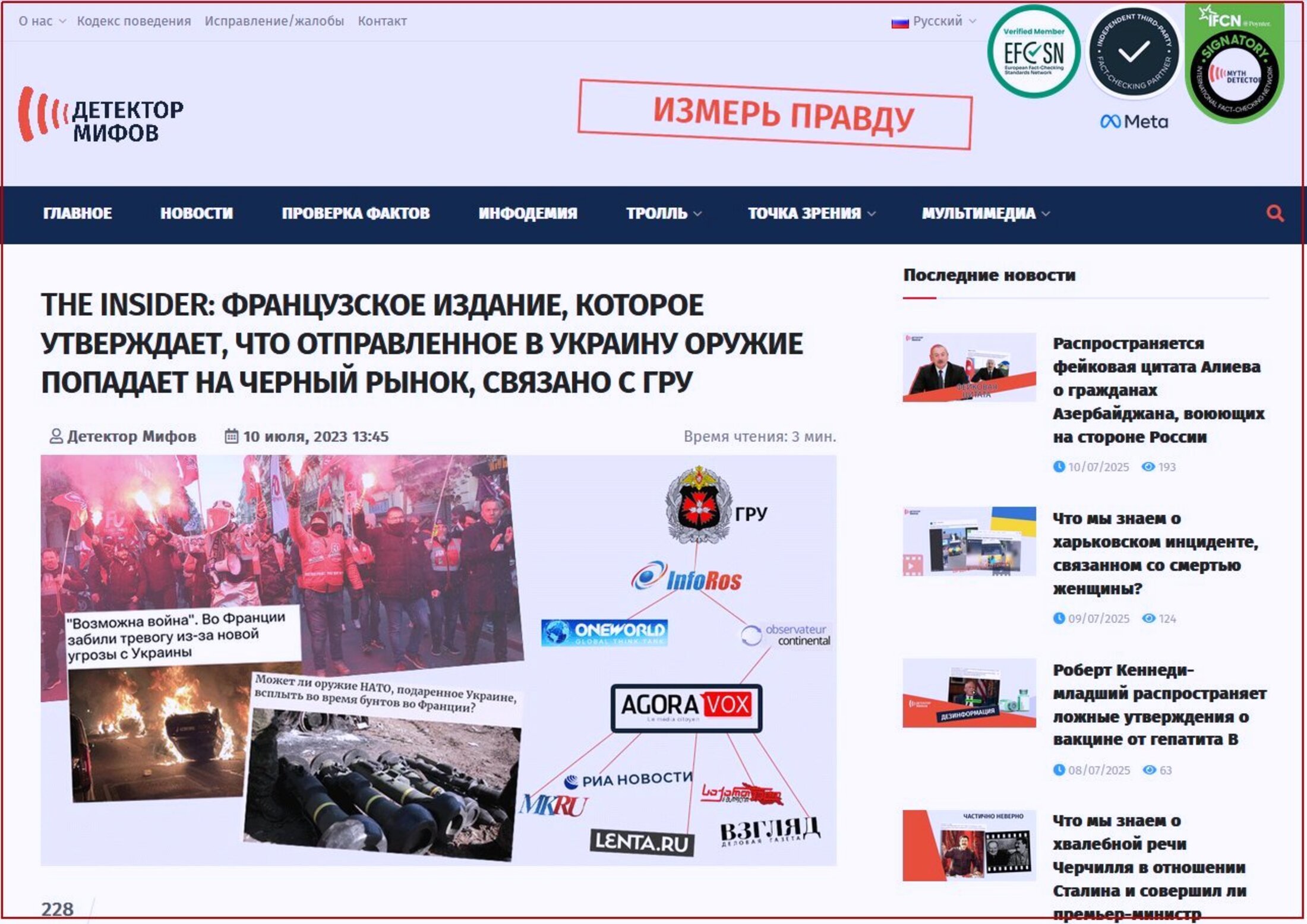 Un autre site web dénonce aussi les liens entre AgoraVox et le GRU. Sur cette page web, le titre en Russe indique : "THE INSIDER : Французское издание, которое утверждает, что отправленное в Украину оружие попадает на черный рынок, связано с ГРУ". Cela se traduit en français par : "THE INSIDER : Un média français, qui affirme que les armes envoyées en Ukraine finissent sur le marché noir, a des liens avec le GRU". Le média français en question, qui a des liens avec le GRU, est évidemment AgoraVox. C’est lui qui diffuse cette grossière intox. Aucune arme envoyée en Ukraine par la France ne finit sur le marché noir. L’arbre proposé par ce site est plus joli que mon organigramme. Au sommet de l’arbre on voit "ГРY" ce qui signifie "GRU".
