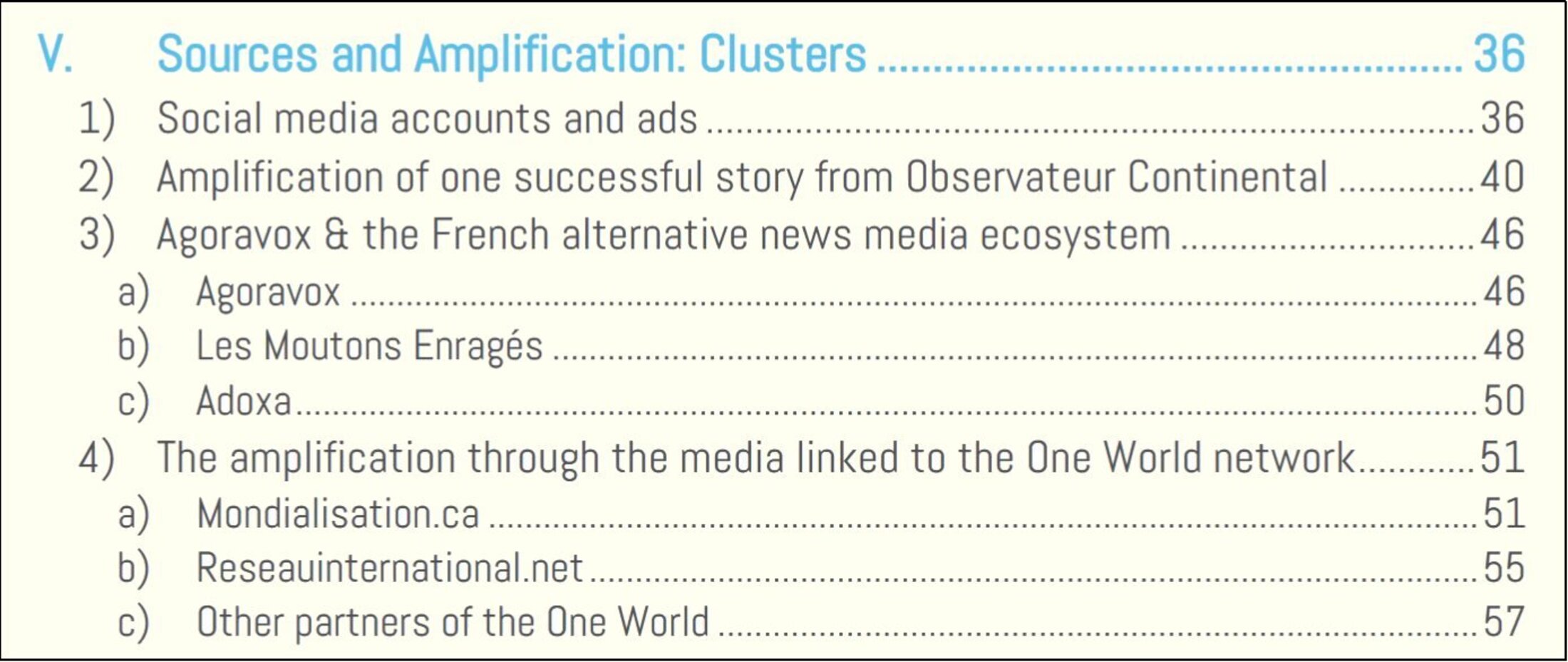 Au point V.2 les auteurs expliquent le mécanisme de l’amplification qui se fait par vagues successives. À partir d’une première amplification faite systématiquement avec des sites qui garantissent une bonne audience, les articles peuvent être repris dans de multiples blogs, pages facebooks, sites divers…