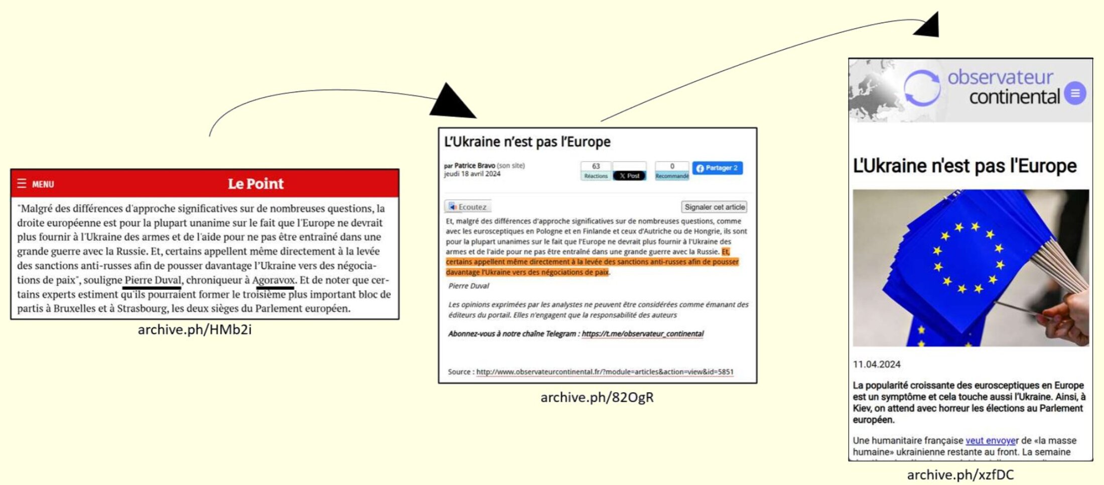 Dans un document qui traite des tactiques de désinformation, une illustration est donnée pour montrer qu’un article du journal « Le Point » reprend en fait une intox venant du GRU par le chemin connu qui passe par l’Observateur Continental et un article proposé par Patrice Bravo sur AgoraVox. Nous reproduisons cette illustration ci-dessous.