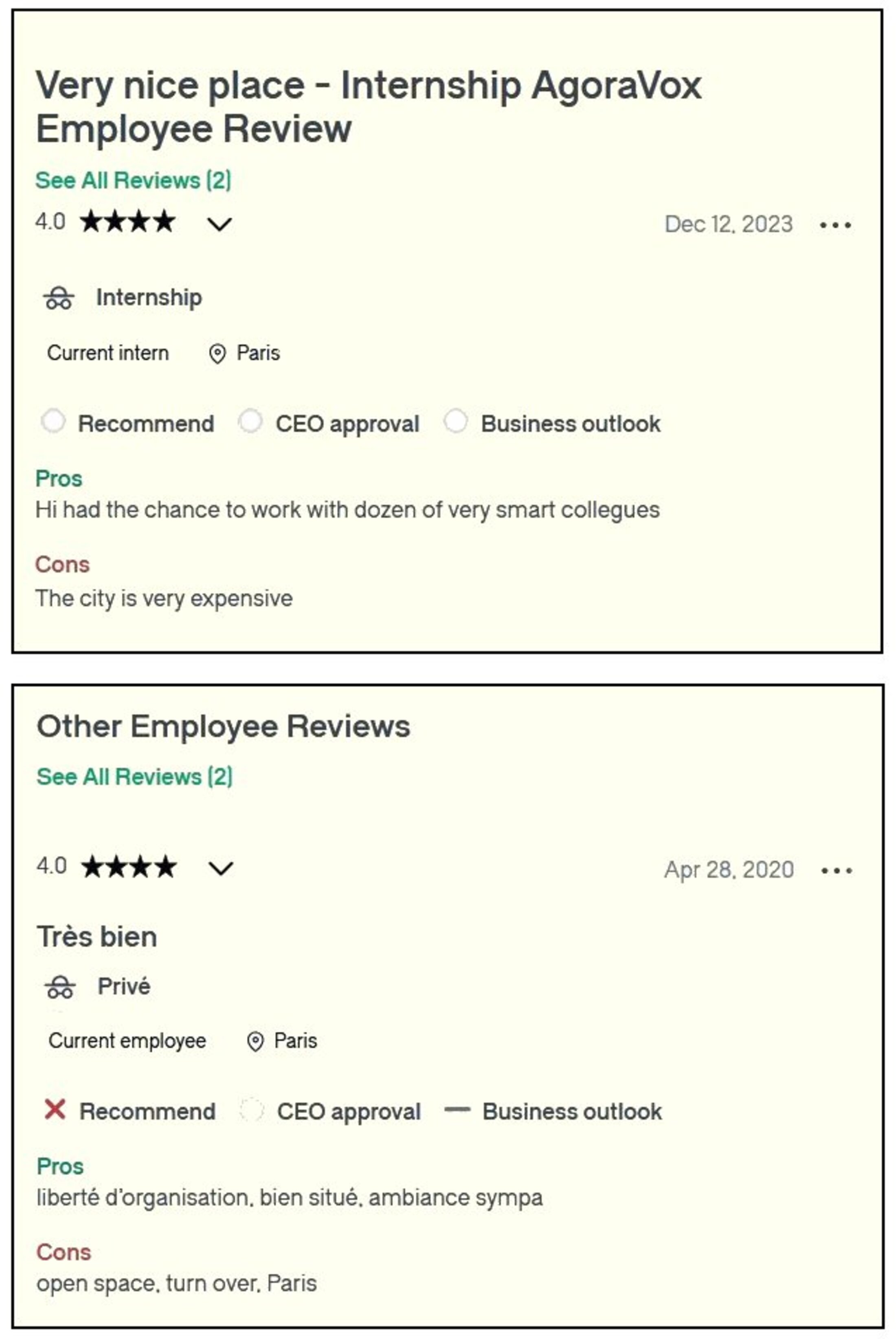 Sur ce document, il est indiqué à la rubrique "taille de la structure" que, depuis 2022, la Société des Rédacteurs serait une Petite ou Moyenne Entreprise (PME). Cela paraît incompatible avec la description ci-dessus. J’imagine que dans cette PME, une douzaine d’employés travaillent sur ordinateur dans une grande pièce avec, probablement une bonne proportion de stagiaires et une hiérarchie respectée. Les stagiaires étrangers doivent penser que le coût de la vie à Paris est élevé. Se loger, se nourrir, se vêtir coûte deux fois plus cher à Paris qu'à Moscou. Mais tout cela n’est que le produit de mon imagination et des avis laissés sur Glassdoor par des employés ayant travaillé chez AgoraVox en 2020 et 2023.