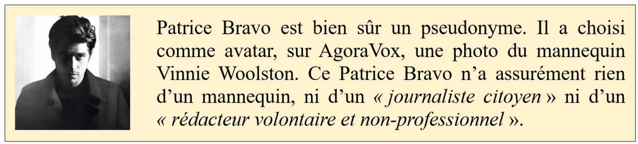 Sous le pseudonyme de « Patrice Bravo » se cache en fait un mercenaire à la solde du GRU. Ses armes ne sont pas les mêmes que celles de ses collègues du groupe Wagner. Son rôle est d’utiliser AgoraVox et d’autres sites comme amplificateurs pour diffuser les articles de propagande des spécialistes du GRU. Il a fallu pour cela un plein accord de la direction d’AgoraVox. Nous regarderons si cela a pu être fait légalement et en respectant l'objectif affiché de « préserver l’indépendance éditoriale du site ».