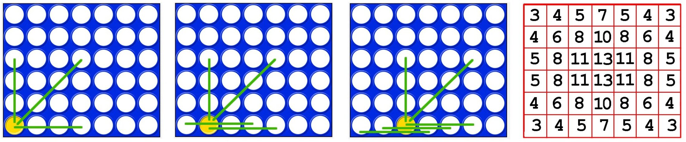 Pour « puissance 4 », nous disposons aussi d’une heuristique qui permet de ne pas développer tout l’arbre. Cette heuristique s’exprime avec le tableau de nombre ci-dessous. Dans chaque case, nous avons le nombre d’alignements gagnants possibles quand un pion est placé dans cette case. Les trois premières figures montrent les premières étapes de la construction de ce tableau. Je les ai prises sur le site web de Christian Schmidt.