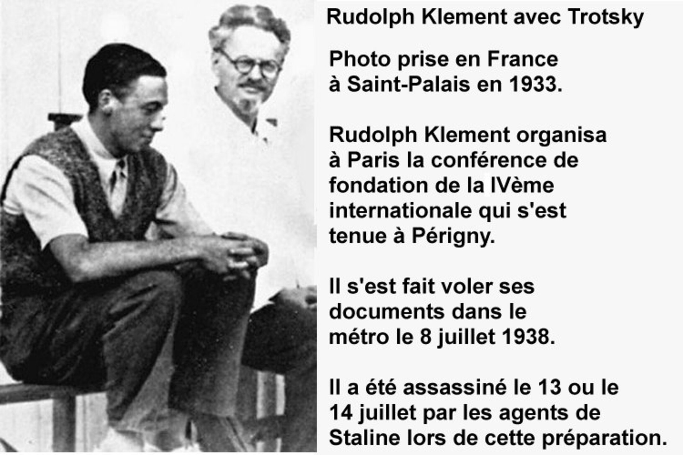 - En septembre 1938, Michel Raptis (Pablo) alors appelé Speros participe à la conférence de fondation de la IVème internationale sans être, de mon point du vue, réellement trotskyste. Nous savons dans quelles conditions difficiles cette conférence a été préparée. Je renvoie, sur ce sujet, le lecteur à mon livre « La chasse aux trotskystes en Europe occidentale ». Rudolf Klement, se charge de la préparation et il a probablement été satisfait de trouver ainsi sur place un délégué Grec qui n’a aucune note de frais. Pablo représente l’EOKDE aux côtés de Busson (Vitsoris) qui représente la KDEE (les archiomarxistes). Les deux sont favorables à la nécessité de la IV°Internationale. La fusion des deux groupes est décidée lors de la conférence mais les deux délégués sont mal placés pour la mettre en œuvre en Grèce. En fait, le véritable représentant de l’EOKDE aurait dû être Pantelís Pouliópoulos mais celui-ci a préféré ne pas faire le déplacement. Il savait que Pablo était venu se soigner de la tuberculose à Saint-Hilaire du Touvet près de Grenoble après un bref séjour en Suisse. Pantelís Pouliópoulos a donc proposé lui-même que Pablo soit désigné comme représentant pour la EOKDE.