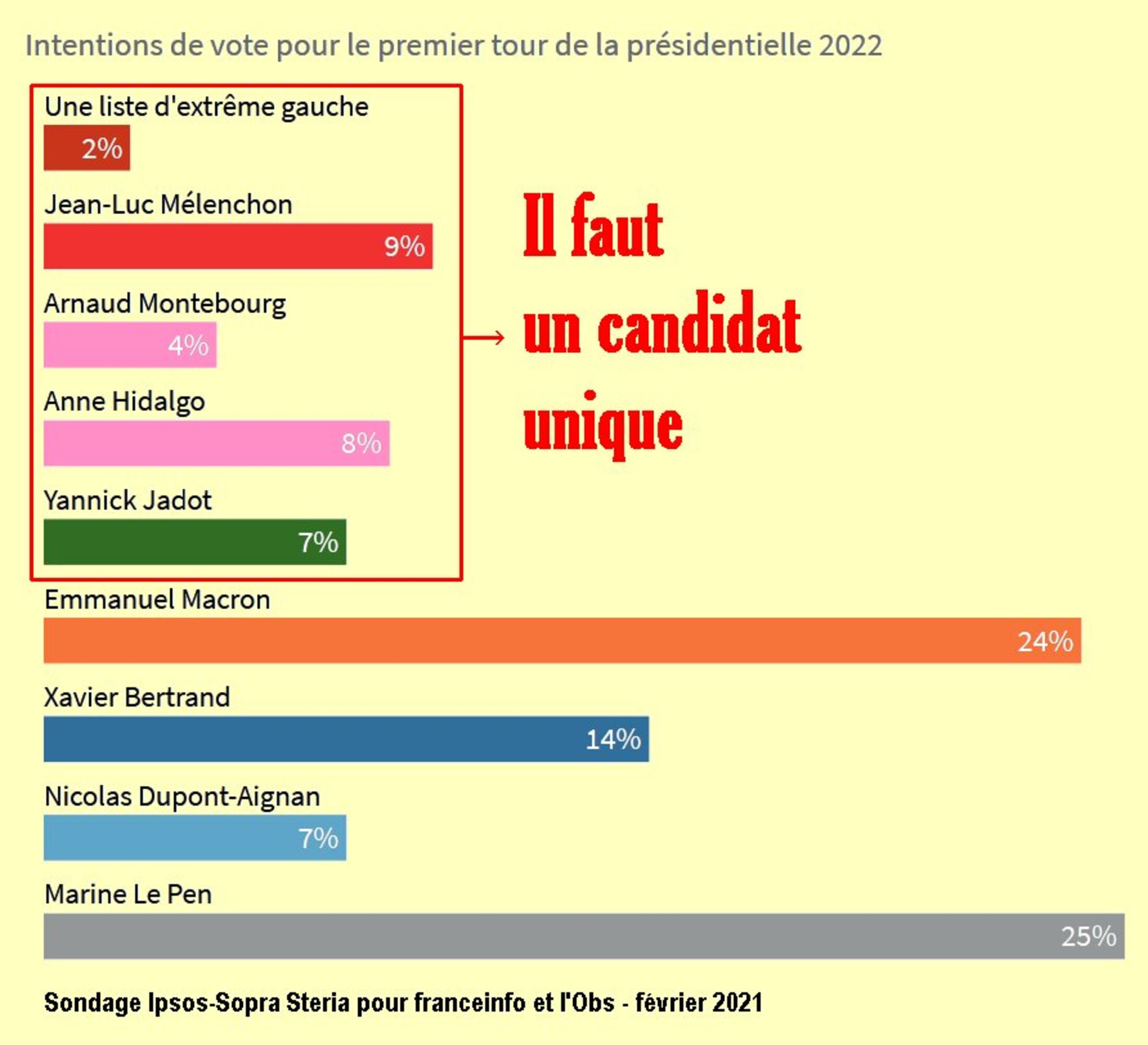 Pour avoir une idée de l’évolution de l’opinion à propos des présidentielles de 2022, je propose, en cédant au vocabulaire des journalistes, de taper dans un moteur de recherche les mots « candidat unique gauche 2022 ». Nous voyons immédiatement qu’une quantité de prise de position et de propositions apparaissent. Il est question de « l’appel des 1000 » signé par des personnalités comme Clémentine Autain, Damien Carême, Cyril Dion, Thomas Piketty... Une pétition est lancée et elle a déjà recueilli plus de 25 000 signatures. Un collectif crée « 2022 ou jamais » pour mettre en place un processus de désignation d'un candidat unique de « la gauche ». Les sondages sont clairs : si les candidats de « gauche » se présentent en ordre dispersé aucun n’atteindra les 10% alors que Macron et Le Pen auront environ 25%. Un autre sondage montre que les sympathisants de gauche souhaitent une candidature unique à 72 %. Enfin et surtout, pour les régionales dans les « Hauts de France », les organisations ouvrières et les verts se sont mis d’accord pour présenter un candidat unique. L’un des multiples articles consacré à l’affaire commente ainsi :