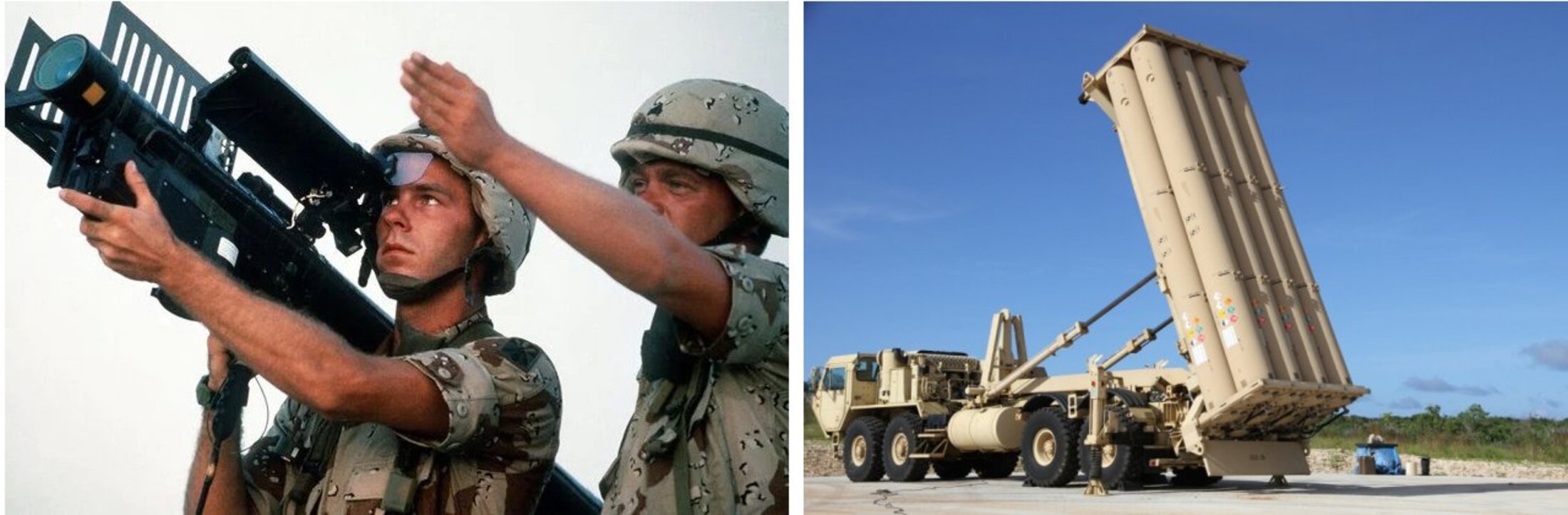 Missile Stinger portable (à gauche) et défense anti-aérienne THAAD (à droite)