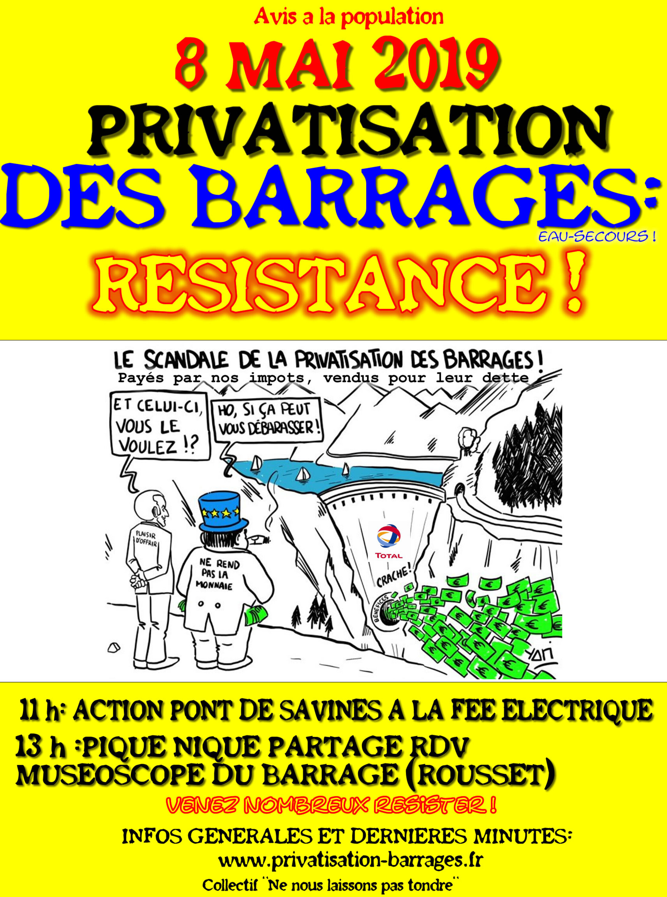 Nous vous invitons à nous rejoindre ce 8 mai 2019 pour acter la résistance à la vente des barrages aux privés ! Le rendez-vous est fixé à 11 h à Savines devant la statut électrique pour déposer une action symbolique.