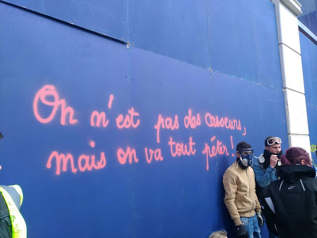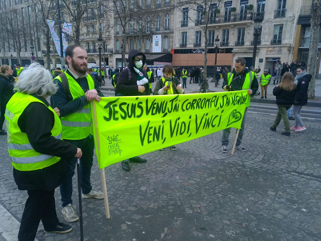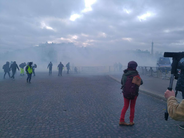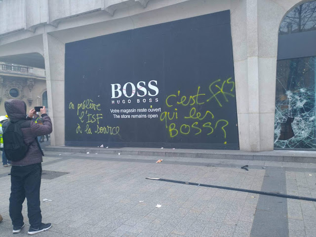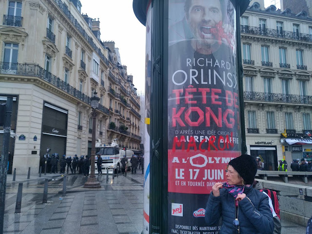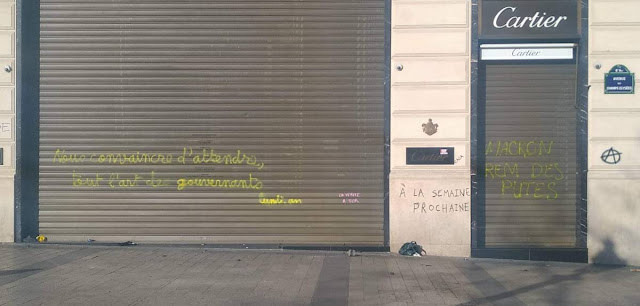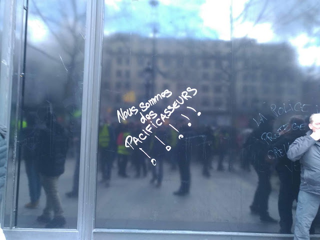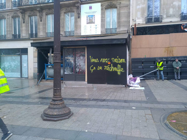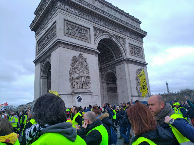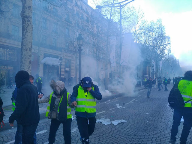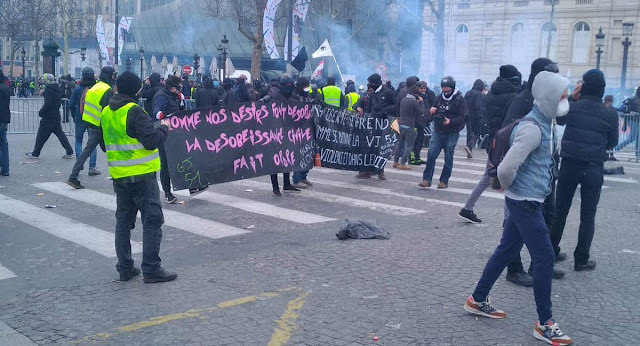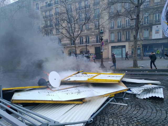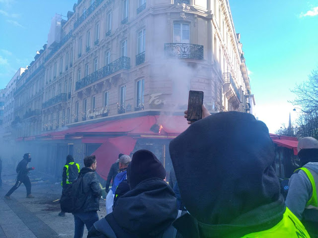 De l'autre coté de Paris, la manif des gilets jaune au champs et à l'arc de triomphe, un climat de chaos qui donne un avant gout des prochaines révoltes que va engendrer le chaos climatique. Le gouvernement a décidé clairement de laisser faire. Alors les gilets jaunes déterminés , ceux qui en prennent pleins la gueule depuis 4 mois vont se défouler.