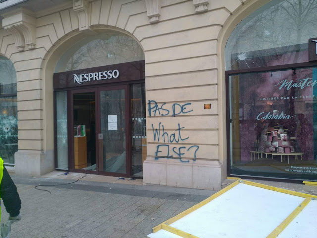 Les champs Élysées leur lieu de pèlerinage. Il a été saccagé, ravagé avec la complicité tactique du gouvernement qui souhaite en tirer les marrons politiques. Ca va marcher c'est tellement facile et le propagande tellement institutionnalisée. Quelques vitrines aux Champs, 15 000 morts pour le chômage et la misère, 40 par jours. Et l'écocide qui vient. Le capitalisme fera dans quelques décénies passer le stalinisme pour un pique nique !