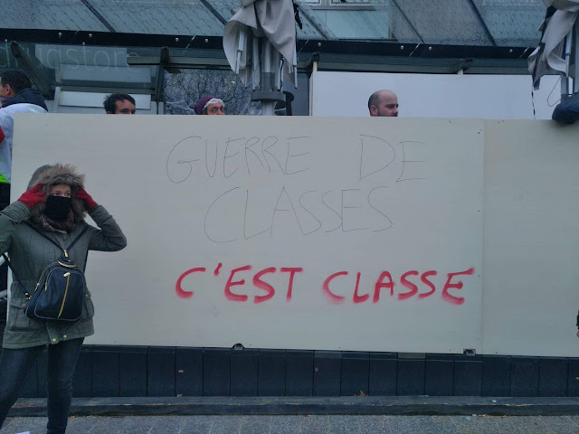Y'a du monde, beaucoup moins de moins qu'à l'autre manif, mais tellement plus déterminés en colère, équipés aguerris, qui reprennent en cœur révolution, révolution.... Pour eux la cause est entendu l’égoïsme à ici son avenue...Le problème identifié le capitalisme et sa classe dominante, les bourgeois.