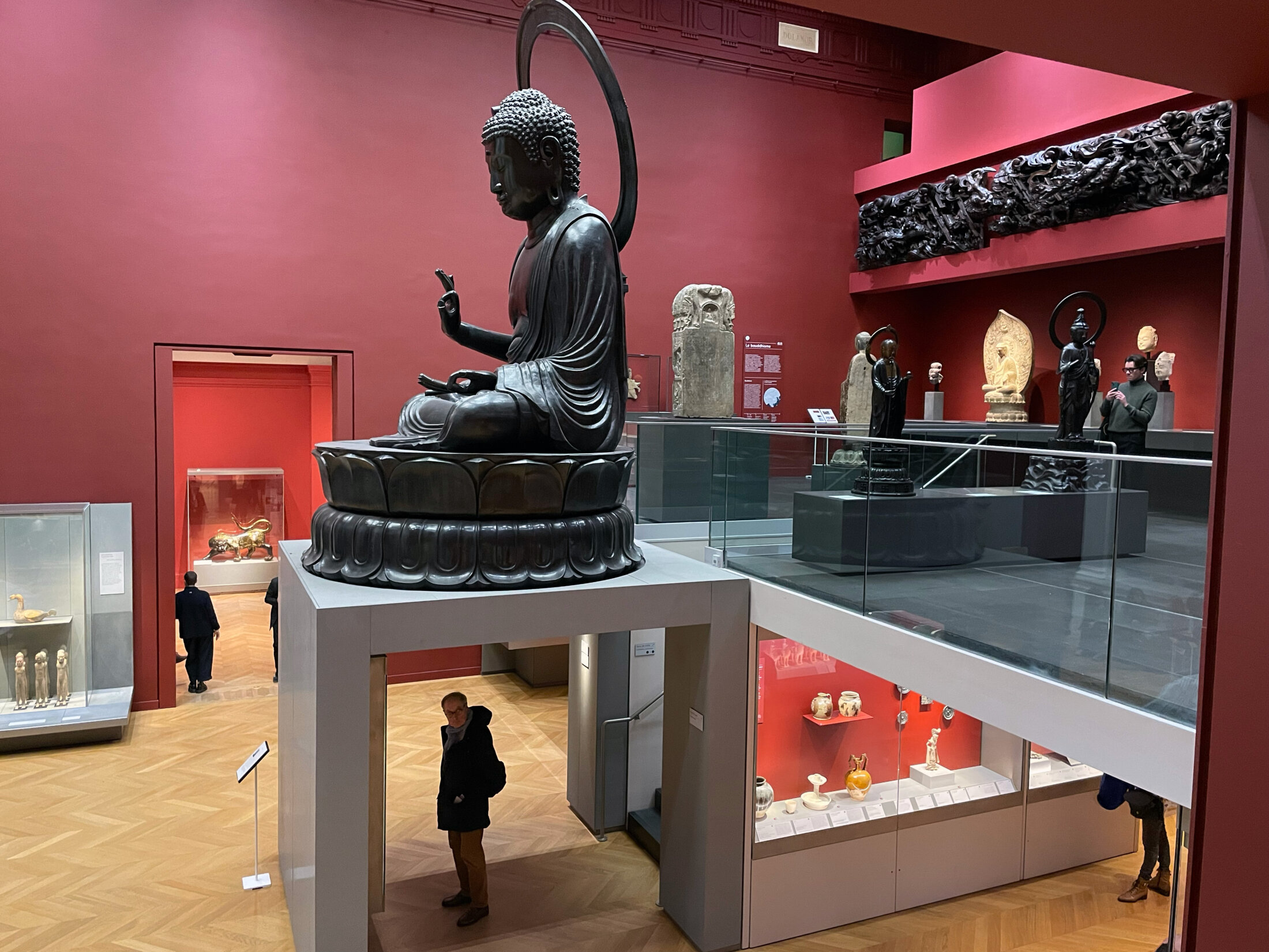 Nous étions a priori intéressés de visiter l'exposition sur l'estampage intitulée Chine. Empreintes du passé et sous-titrée Découverte de l’antiquité et renouveau des arts. 1786-1955 qui se tient jusqu'au 15 mars 2026. "Des lettrés et des moines archéologues parcouraient montagnes et sanctuaires en quête d’inscriptions antiques gravées sur la pierre ou coulées dans le bronze. Ces signes et formes archaïques inspirent des œuvres dont la modernité naît de l’association inédite entre calligraphie, peinture et estampage : une rencontre qui témoigne de la révolution visuelle en cours dans la Chine du XIXe siècle... L'estampage est une technique consistant à appliquer sur les stèles des feuilles de papier humides qui épousaient creux et reliefs avant de les recouvrir d’une couche d’encre qui permettait de révéler le détail des graphies. Cette méthode d’abord utilisée pour conserver textes et inscriptions va progressivement être utilisée pour transmettre l’image de bas-reliefs historiés, de sculptures, et même de vases rituels dans leurs trois dimensions. En cet âge pré-photographique, l’estampage était un vecteur capital de reproduction et d’étude des vestiges du passé, dont la diffusion était assurée par le livre illustré..." C'est évidemment magnifique et fascinant. Christiane joue même avec quelques tampons pour agencer une rapide petite composition florale.