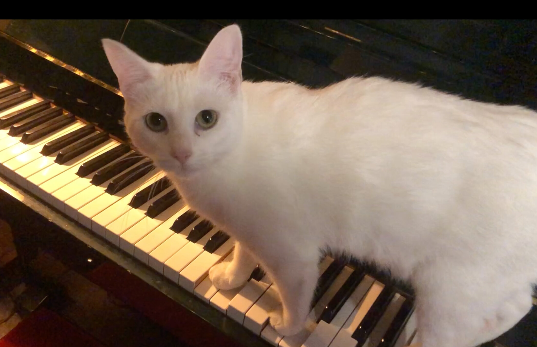 Parmi les 11 séquences actuellement proposées, l'une d'entre elles était fort particulière, puisqu'il s'agit d'une vidéo d'un chat blanc marchant sur le clavier d'un piano sans aucune prétention musicale. J'ai donc répété huit fois cet "haïku fortuit" de 23 secondes pour arriver à neuf comme les neuf vies d'un chat, le chat à neuf queues ou la neuvième symphonie, souvent inachevée. J'ai ensuite traité, toujours en temps réel mais cette fois sur plusieurs pistes, la nouvelle séquence passée à 3 minutes 30 avec divers algorithmes du Cosmos, un appareil encore de chez Soma, sorte de délai aléatoire permettant aussi triturer la réverbération ou la granularité. Au fur et à mesure des répétitions, j'ai tenté de laisser croire à diverses réactions du chat blanc (probablement une chatte) en fonction de l'évolution de la pièce. J'ai même ajouté quelques notes à l'envers lorsqu'il ou elle secoue ses oreilles. Le ré récurrent termine la pièce de manière à souligner le processus intrinsèquement évident. Elle se rapproche de certaines de mes pièces répétitives comme les petites boucles du scratch vidéo interactif Machiavel ou l'opéra Nabaz'mob. Je l'ai appelée naturellement La 9ème du chat, répétition en do majeur. Il me reste à la tester sur Lola, Oulala et Django.