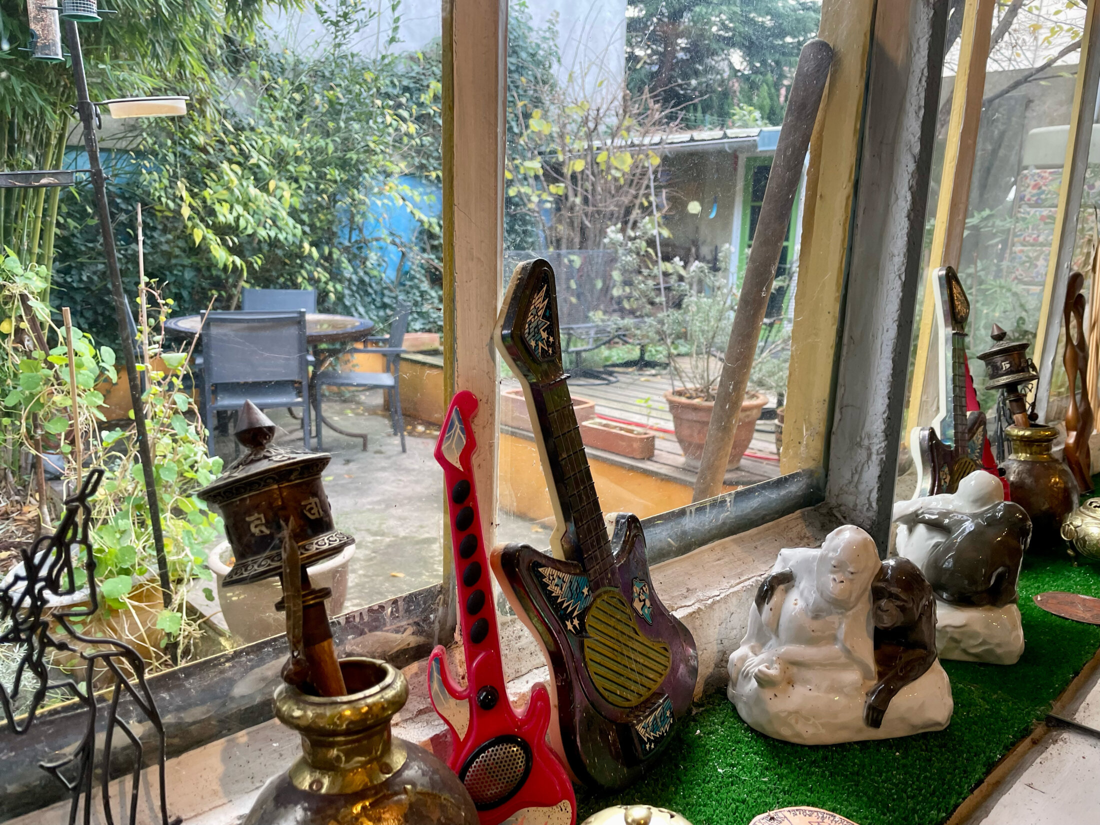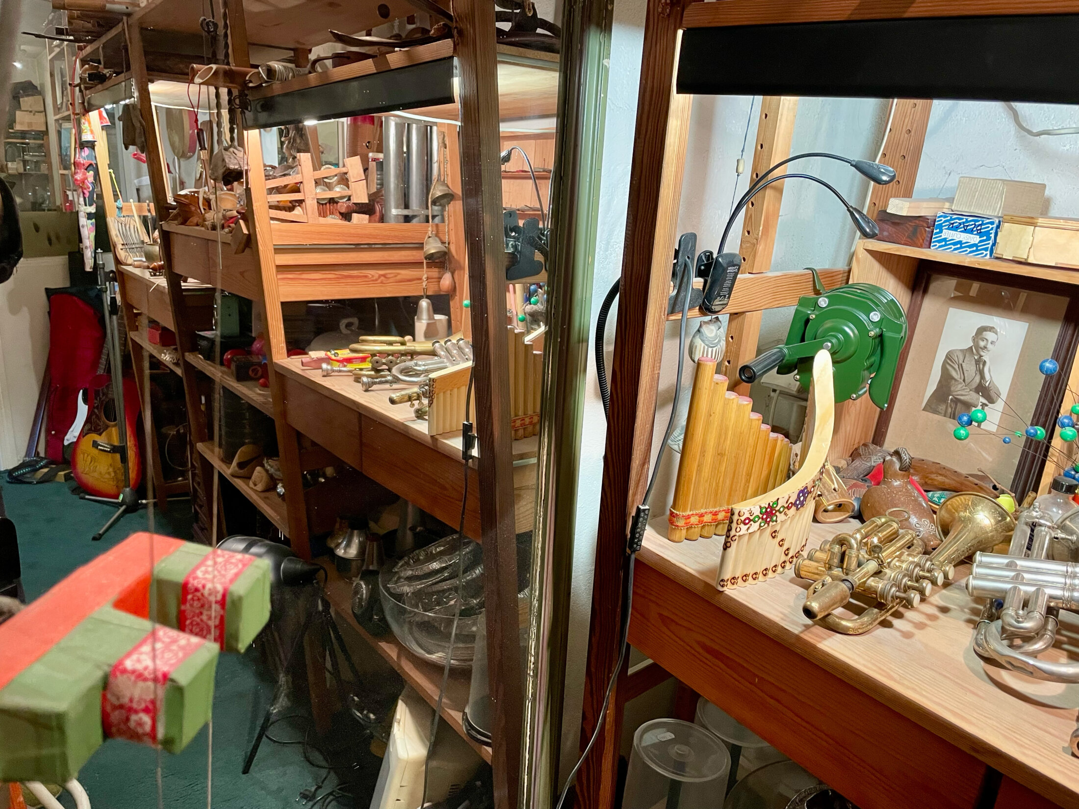 J'ai placé les deux autres derrière les étagères de la cabine qui est forcément exiguë. Il y en avait déjà un grand tout au fond. Sous certains angles elle semble beaucoup plus spacieuse. Elle abrite des centaines d'instruments du plus gros, le piano, aux plus petits, des appeaux d'oiseaux. Les tiroirs en sont pleins. Les plus beaux, violons ou cors, sont rangés dans leurs boîtes. Certains sont plutôt encombrants comme les synthés vintage, les guitares ou le frein, une contrebasse à tension variable construite par Bernard Vitet. Sur les étagères ou dans les tiroirs, je les ai regroupés par famille, les percussions en bois ou celles en métal, les flûtes, les vents, les guimbardes, etcétéra. Dans les pièces les plus lumineuses de la maison il n'y a aucun miroir, même minuscules. C'est inutile et j'aime bien caractérisé chaque espace. Seuls des tableaux sont accrochés au rez-de-chaussée, tandis qu'au premier les murs sont blancs avec absolument rien d'affiché si ce n'est les bibliothèques qui occupent des pans entiers (il y en a sept en tout, toutes thématiques !). Même chose dans l'escalier, la première volée de marches est vierge alors que des œuvres habillent la montée jusqu'au deuxième étage éclairée par un vélux. Ma préférée est l'ange d'Ella & Pitr qui perd l'équilibre et semble dégringoler.