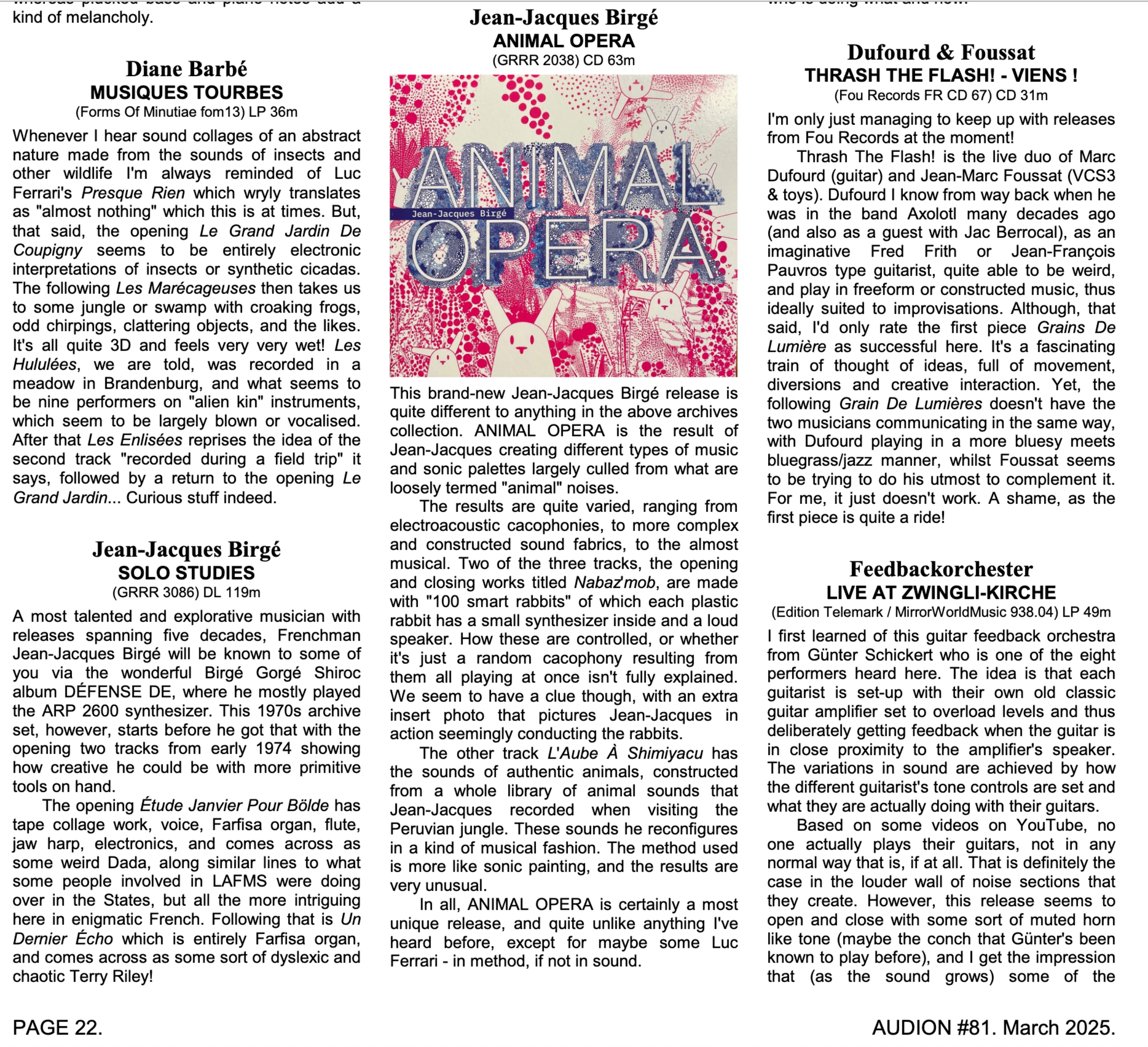 Alan Freeman chronique trois de mes albums sur le numéro 81 de la revue Audion (mars 2025). Le premier, Solo Studies, n'est accessible qu'en ligne sur drame.org et date d'avant mon premier disque, soit 1974. Le second, Animal Opera, est le plus récent ; il rassemble l'opéra Nabaz'mob pour 100 lapins Nabaztag et un enregistrement de field recording, sans aucun mixage, réalisé l'été dernier en Amazonie. Un extrait de chacun de ces albums figure sur la version multimedia de la revue. Le troisième, Tchak, est un disque de 2000 inédit d'Un Drame Musical Instantané, dernier enregistrement avec Bernard Vitet, accompagné de Nem et du guitariste Philippe Deschepper.