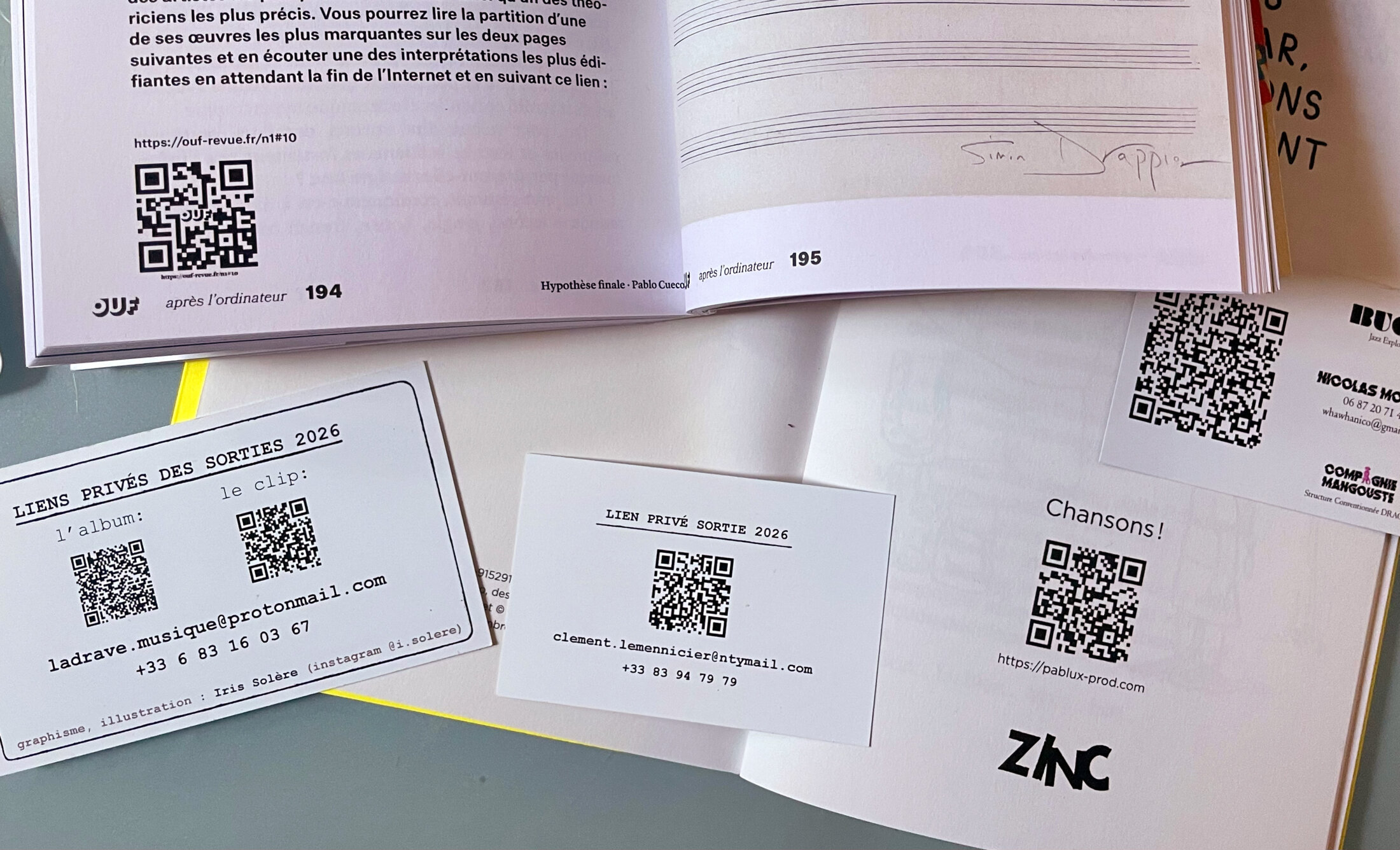 Souvent les QR codes renvoient à des clips. La vidéo minuscule, lorsqu'elle n'est pas créative, se conçoit, mais jamais le son. Je me penchent tout de même sur celles de Audusseau en duo avec le trompettiste Clément Lemennicier... Voilà vingt ans que les organisateurs de spectacles exigent de voir la musique : auraient-ils perdu confiance en leurs oreilles ? Cela me rappelle Edgard Varèse se moquant des spectateurs qui avaient besoin de voir ce qui se passe dans la fosse ! Cela peut pourtant être pédagogique. Aujourd'hui, sur les écrans, on croit voir, on n'entend rien. Les QR codes ne sont pas une si mauvaise idée, mais il faut trouver le moyen de les ouvrir facilement sur un système plus adéquat qu'un smartphone. Je crains de ne pouvoir y échapper pour un projet en cours et cela me contrarie.