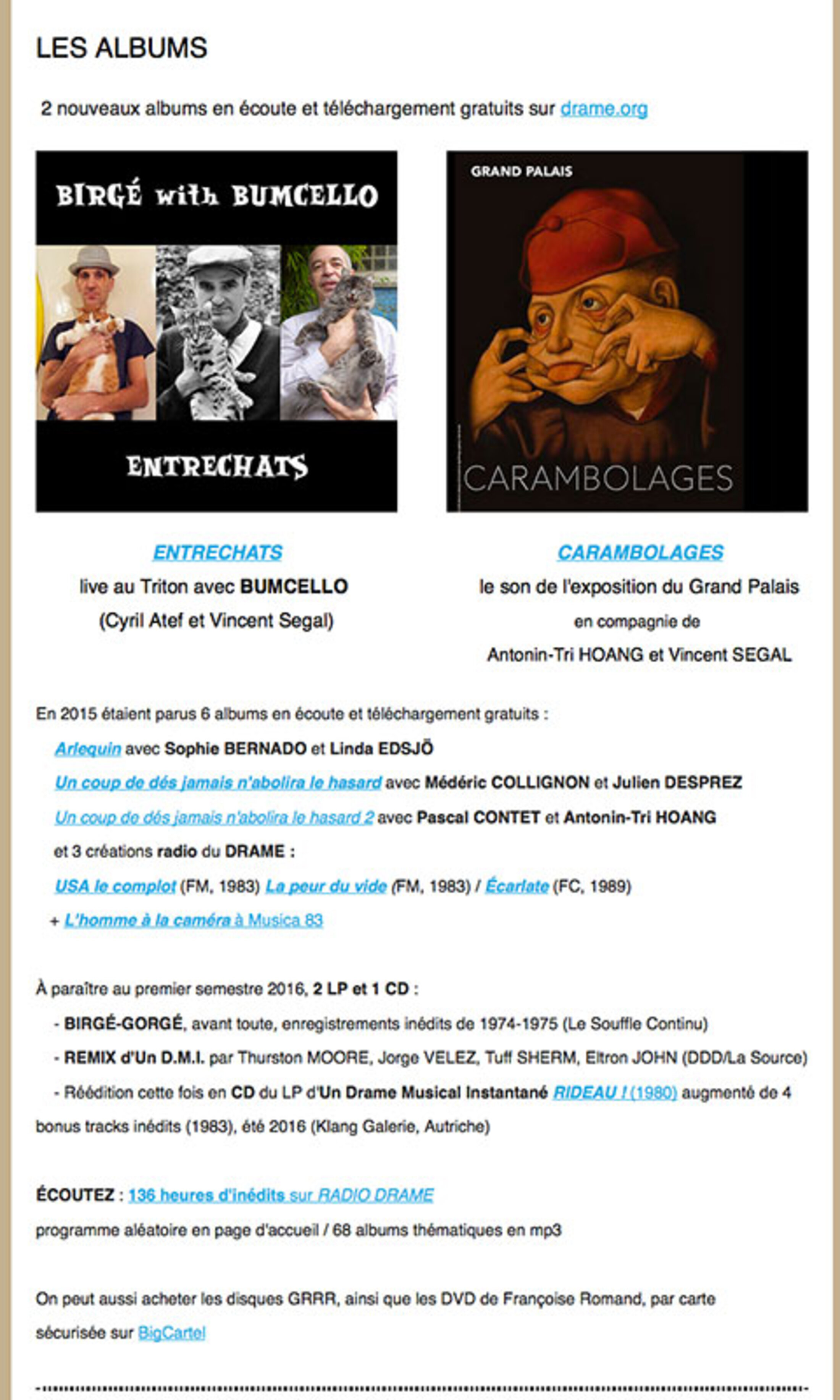 Avant de s'envoler pour Bahreïn où elle reprend l'opéra Carmen avec l'Orchestra di Piazza Vittorio, Elsa m'a aidé à mettre en forme ma newsletter. Cette actualité est longue comme le bras. Envoyée par mail, je l'ai reproduite ici parce qu'elle résume bien ma non-activité. Tout ce qui y est annoncé est terminé à mon niveau. Les expositions suivent leur cours, les disques à paraître sont entre les mains des producteurs, les applications pour tablettes bénéficieront de mises à jour... Il n'y a que le blog qui s'écrive au jour le jour, avec une pause vacances prévue au mois de mai où, Françoise et moi, nous nous envolerons pour Naples, Ischia et les îles éoliennes. Repos bien mérité. Néanmoins, en attendant l'hypothétique coup de fil de Monsieur De Mesmaeker, je classe les archives et prépare l'album du trio El Strøm que nous avons décidé de publier chez GRRR avec Sacha Gattino et Birgitte Lyregaard. Un autre projet personnel me tient à cœur, mais j'ai du mal à m'y remettre sans perspective de débouchés sérieux. On verra cela au retour. Vendredi prochain à 19h je fais aussi un petit set avec Antonin-Tri Hoang pour soutenir le collectif des Baras qui squattent le 72 rue René Alazard à Bagnolet. Venez ! Il y aura aussi Blick Bassy, Étienne et Léo Brunet, Jah Nool Farafina, Dié... Et les Baras, Africains chassés de Libye par notre guerre, auront préparé le mafé et le tiep ! N.B.: si vous souhaitez recevoir la newsletter (avec liens opérationnels !), écrivez à info(at)drame.org