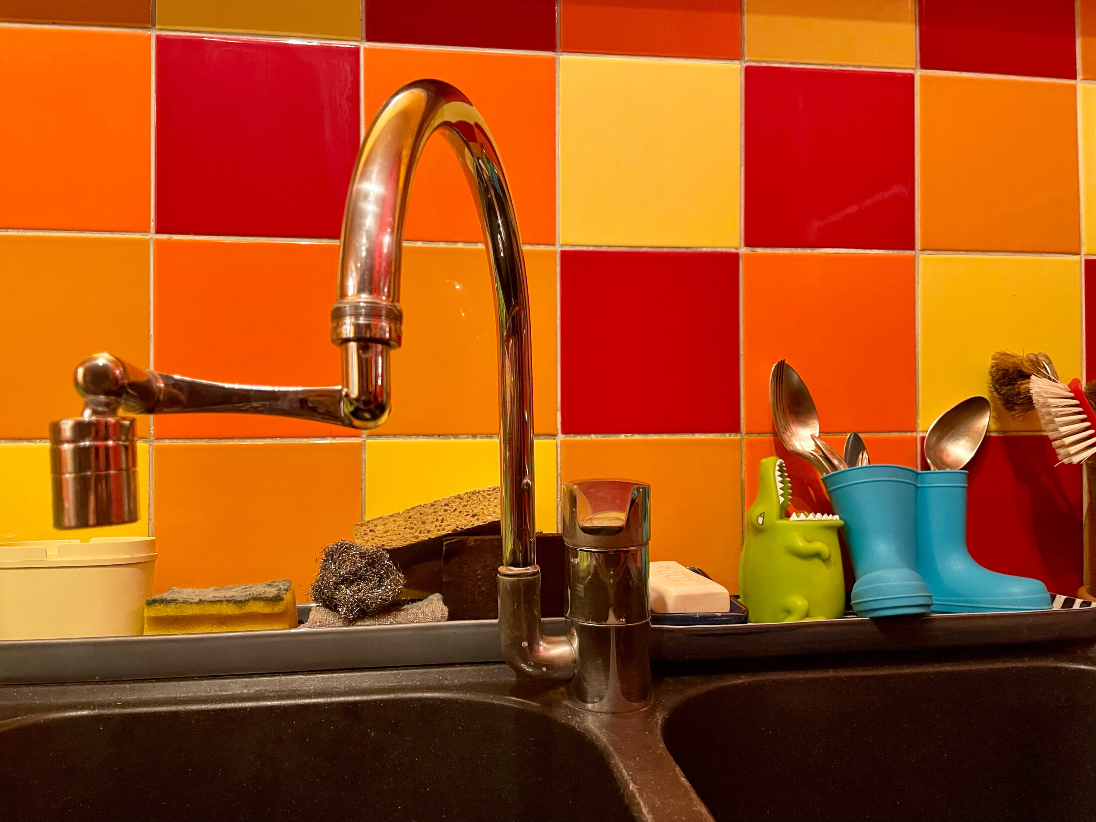 J'avais donc un problème de robinets. Dans la cuisine c'était un col de cygne fixe qui ne permettait pas d'arroser les parois des deux éviers, et ceux des salles de bain étaient en plus si bas qu'il était impossible de s'y pencher sans risquer un tour de rein. Alors je leur ai rajouté un petit accessoire absolument génial si l'on ne veut pas remplacer tout le système, d'autant que chacun ne m'a coûté que treize euros. C'est un "mousseur robinet, aérateur de robinet rotatif à 1080°, aérateur à tamis à économie d'eau, rallonge de robinet buse mélangeuse 2 jets, aérateurs universels pour robinets de cuisine et salle de bain" ! On dit que cela ne s'invente pas, mais c'est tout le contraire, l'objet se serait-il retrouvé au Concours Lépine ? Il s'installe extrêmement facilement, mais j'ai dû tout de même, sur l'un des trois, entourer le pas de vis avec du Téflon pour ne pas que cela goutte. Les chats qui boivent au robinet n'y ont vu que du feu, c'est pourtant bien de l'eau qu'ils goûtent, et je peux désormais orienter mes robinets dans tous les sens, ce qui est très pratique !