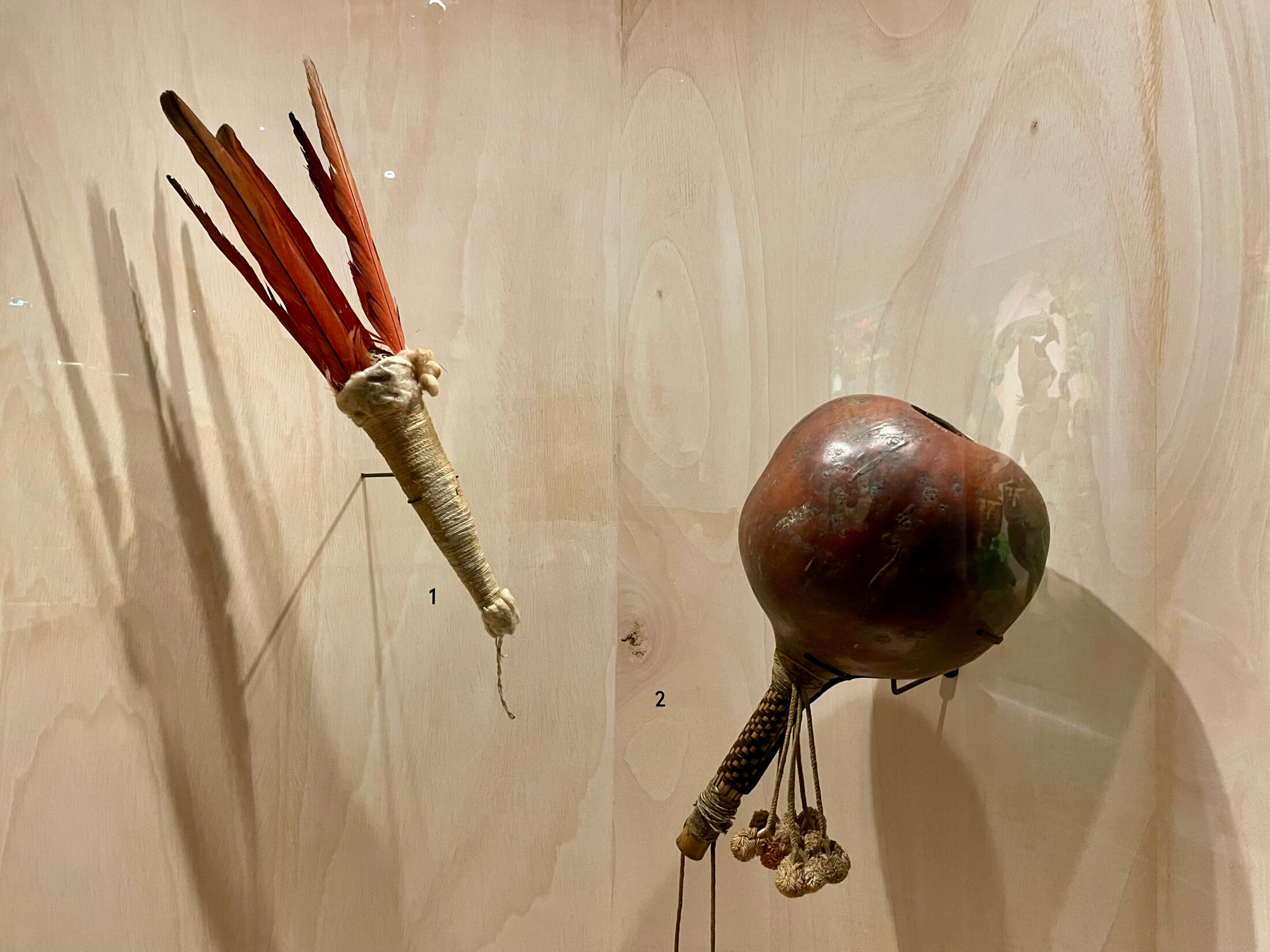 Déçu aussi que l'exposition Musika Automatika de Junior Mvunzi ne soit pas accessible lors de notre visite, je prends quelques photos des instruments de musique montrés à Amazônia, ici un hochet aray et une trompe latérale hohinty, brésiliens comme la plupart de ce qui est exposé. Enfin, puisque le cylindre magique, que Madeleine Leclair m'avait permis de visiter en 2007, est dans le noir, j'achète quelques jouets musicaux pour mon petit-fils à la boutique en sortant.
