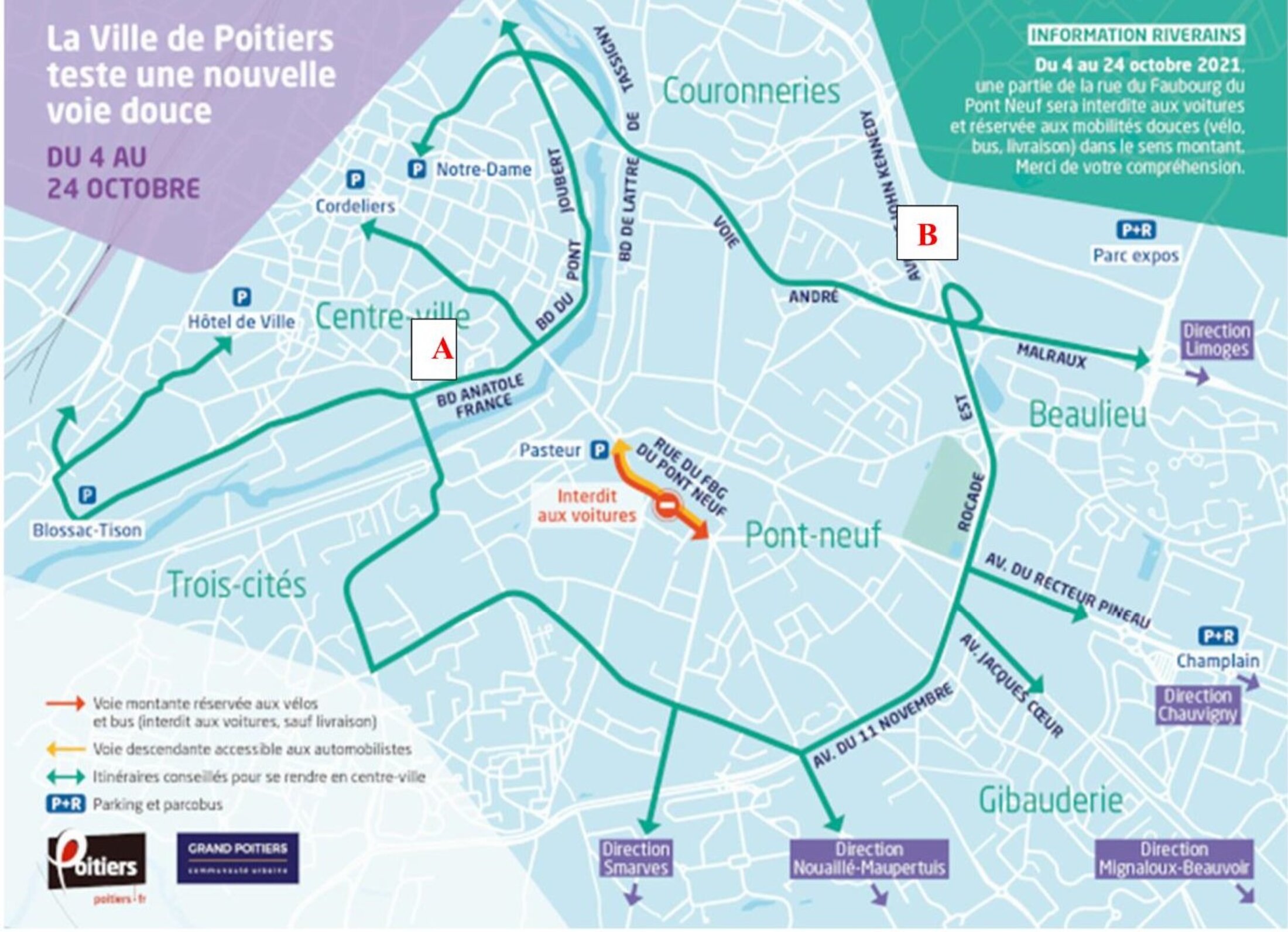 « Afin de faciliter les déplacements à vélo, la municipalité va créer une voie douce rue du faubourg du Pont-Neuf. Soucieuse de trouver l’aménagement le plus adéquat au meilleur coût, la Ville de Poitiers va procéder à des tests de circulation.