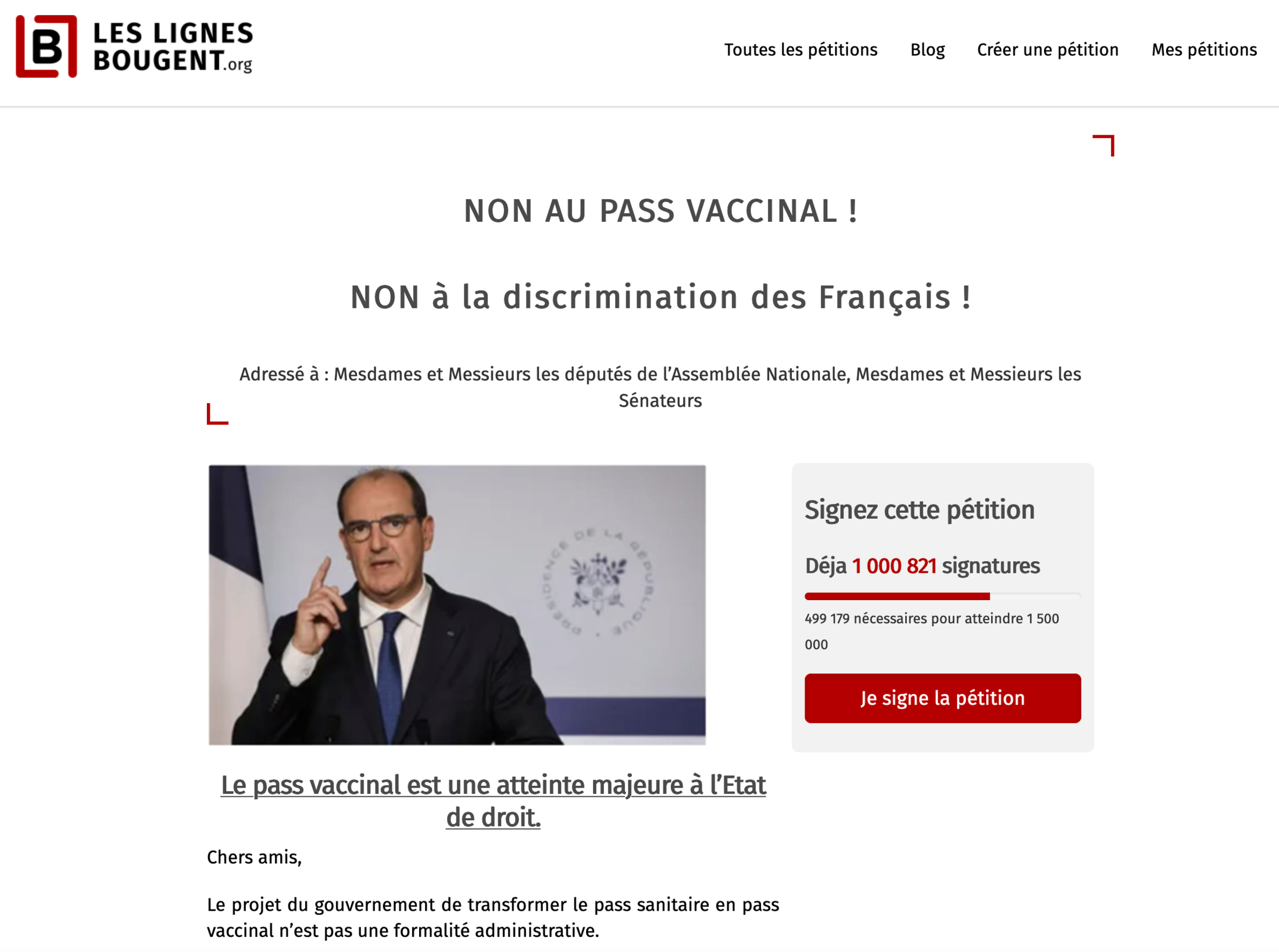 Hourra !!! Une pétition contre le pass vaccinal dépasse 1 million de signatures