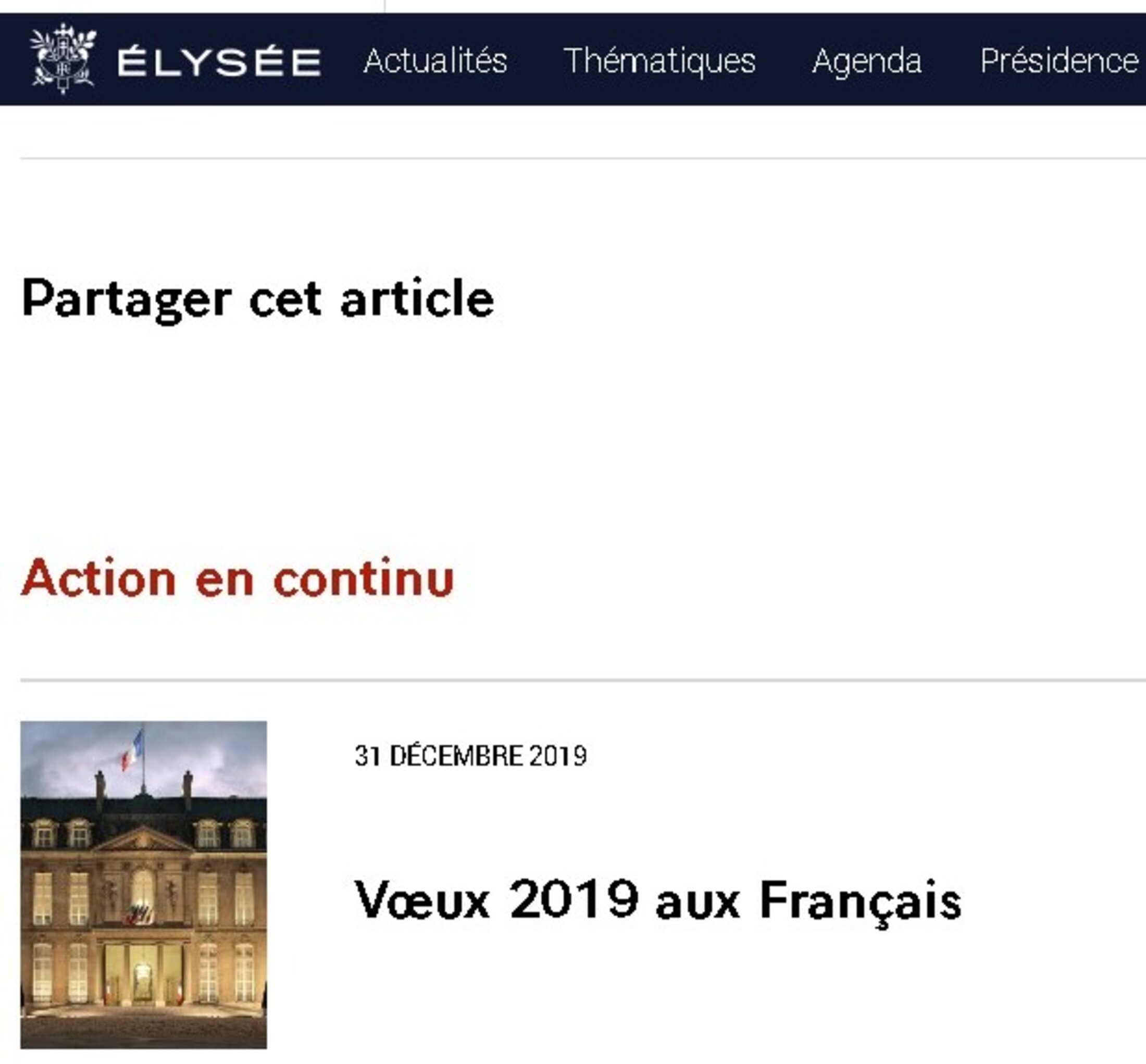 Sacré "lapsus", incroyable et génial. Il est des signes qui ne trompent pas : à l'Elysée, ils sont tellement tourneboulés et pas du tout sûr d'être encore là dans un an, que sur le site internet officiel de la Présidence de la République, les derniers voeux de Macron sont datés du... 31 décembre 2019 !!! Véridique : la preuve par la capture d'écran (2 janvier 2019, 9 h 58)