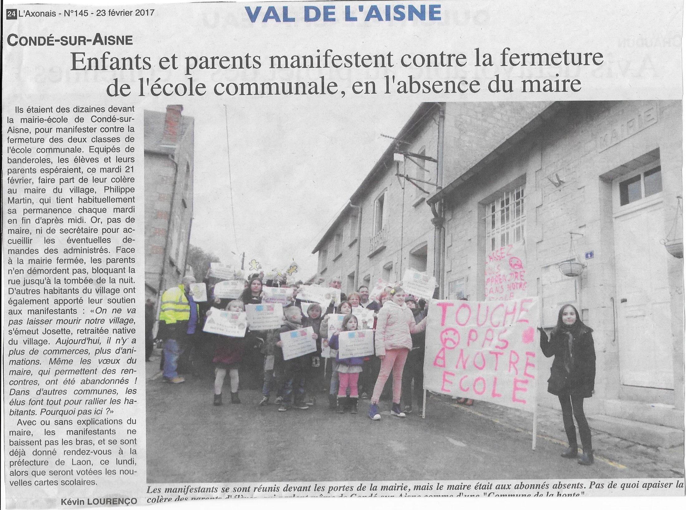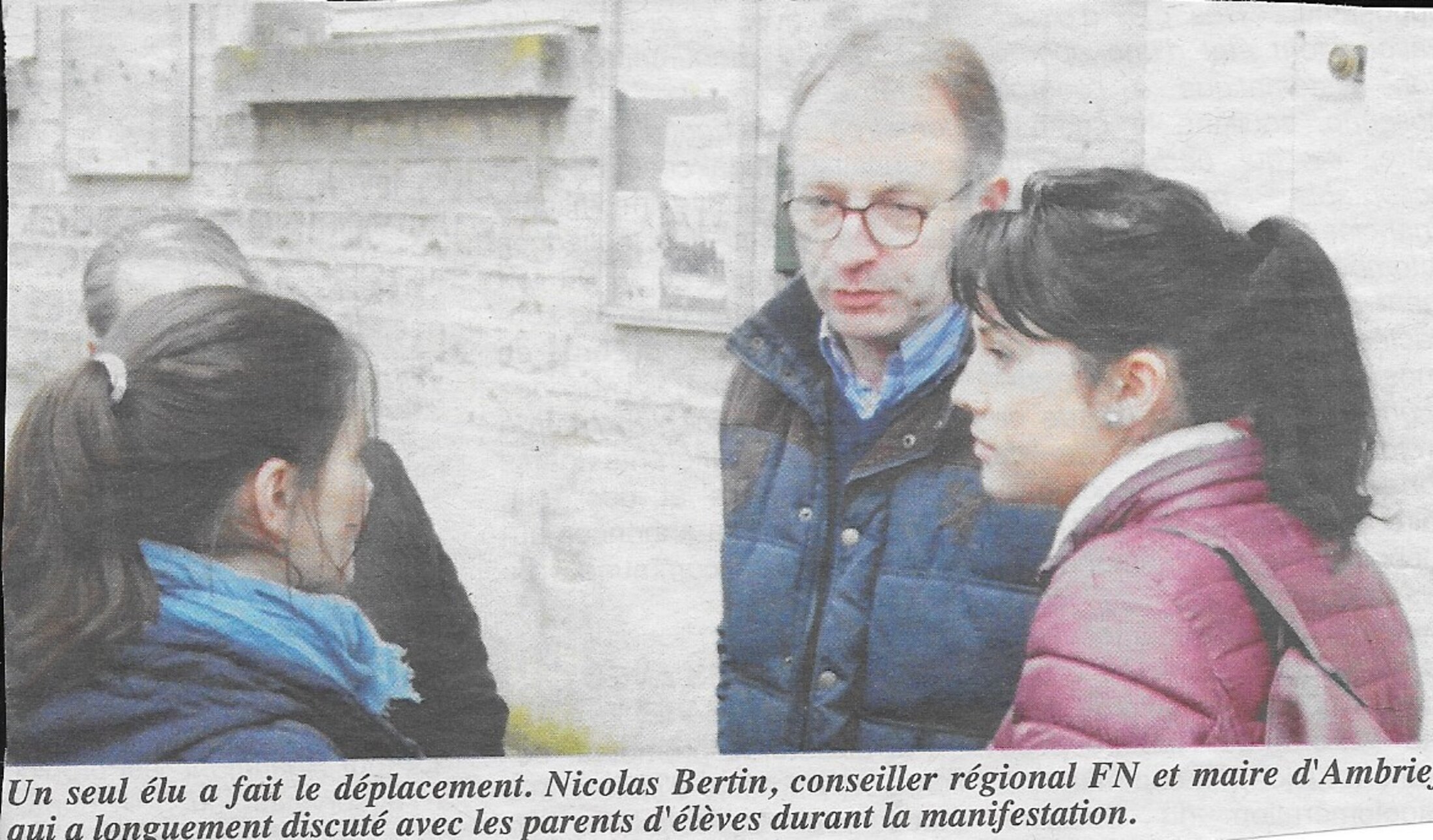 A Condé-sur-Aisne le 21 février dernier, « ils étaient des dizaines devant la mairie école de Condé-sur-Aisne, pour manifester contre la fermeture des deux classes de l’école communale. Équipés de banderoles, les élèves et leurs parents espéraient, ce mardi 21 février, faire part de leur colère au maire du village, Philippe Martin, qui tient habituellement sa permanence chaque mardi en fin d’après-midi. Or, pas de maire, ni de secrétaire pour accueillir les éventuelles demandes des administrés. Face à la mairie fermée, les parents n’en démordent pas, bloquant la rue jusqu’à la tombée de la nuit. (…) Un seul élu a fait le déplacement. Nicolas Bertin, conseiller régional FN et maire d’Ambrief, qui a longuement discuté avec les parents d’élèves durant la manifestation. »